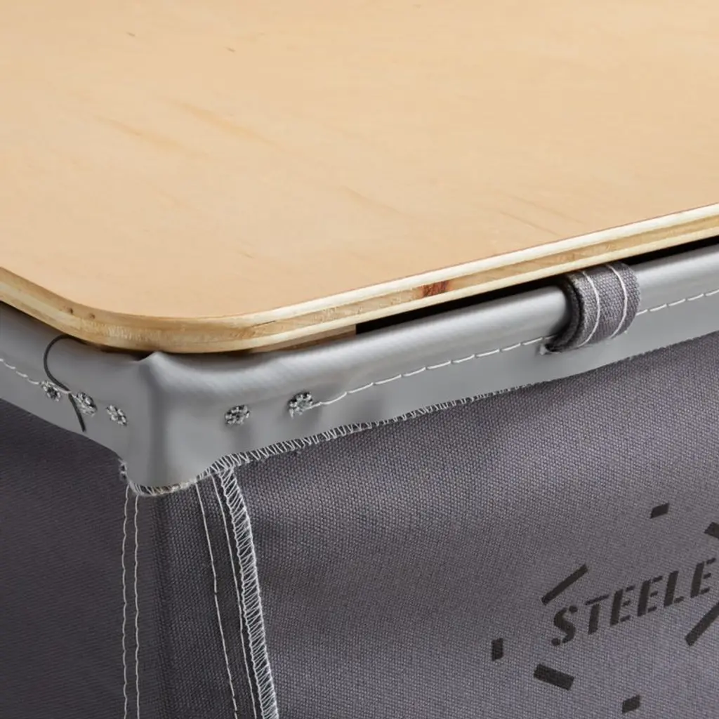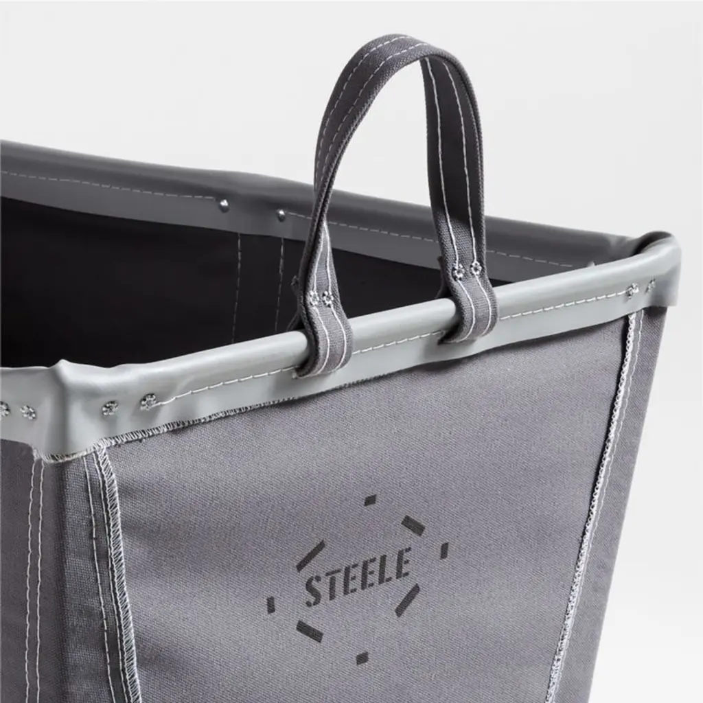 Transform the laundry room into a place of organization and efficiency. These industrial-style canvas trucks store and transfer laundry at an ergonomic, back-saving height. The industrial carts also hold toys, throw pillows, linens and more throughout the house. Manufactured by the Steele Canvas Basket Co., the trucks have sturdy steel frames wrapped in black or natural 100% cotton canvas with thermal plastic rubber edges. Designed with the authentic look and feel of a professional launderer's bin, they glide with ease on rubber casters and hold up to three bushels or 300 pounds of clothes. Wooden lids (sold separately or as part of a set with a bin) keep the contents out of sight and allow the hampers to double as work surfaces for folding laundry. The striking Steele logo is hand-applied on the hampers using the original brass stencil from a century ago, when the company began producing commercial-grade canvas products. Because each bin is cut, bent and welded by hand, there will be a slight variance in size.View all Steele products