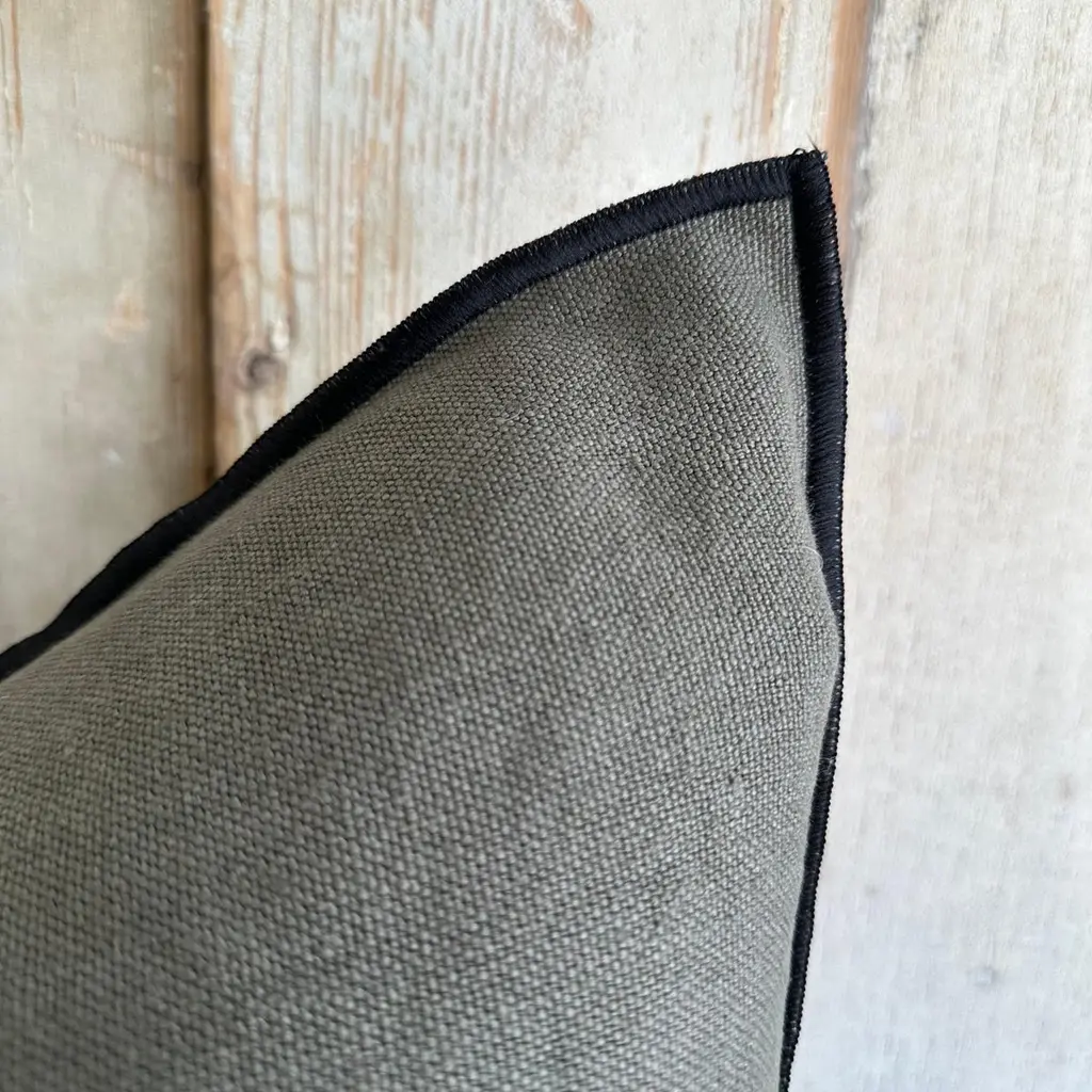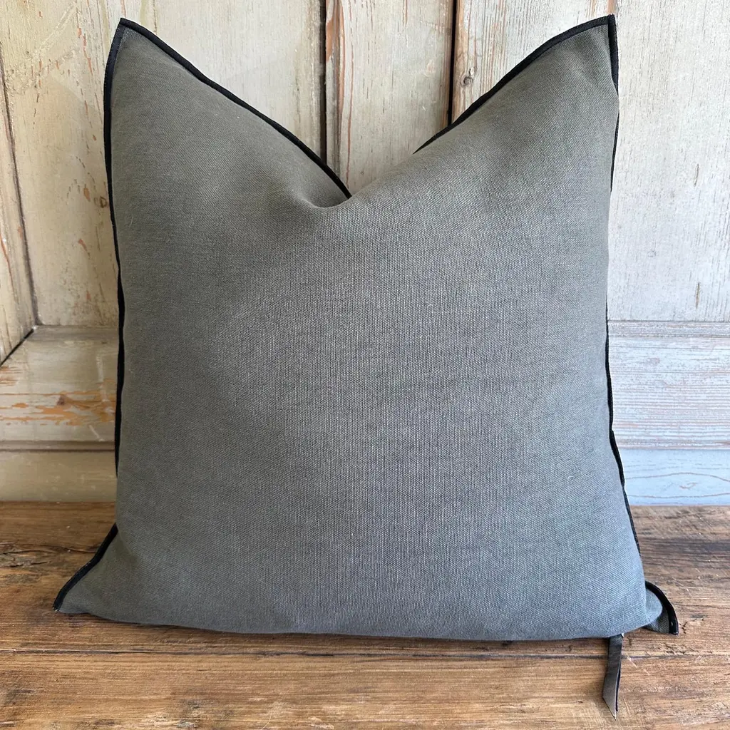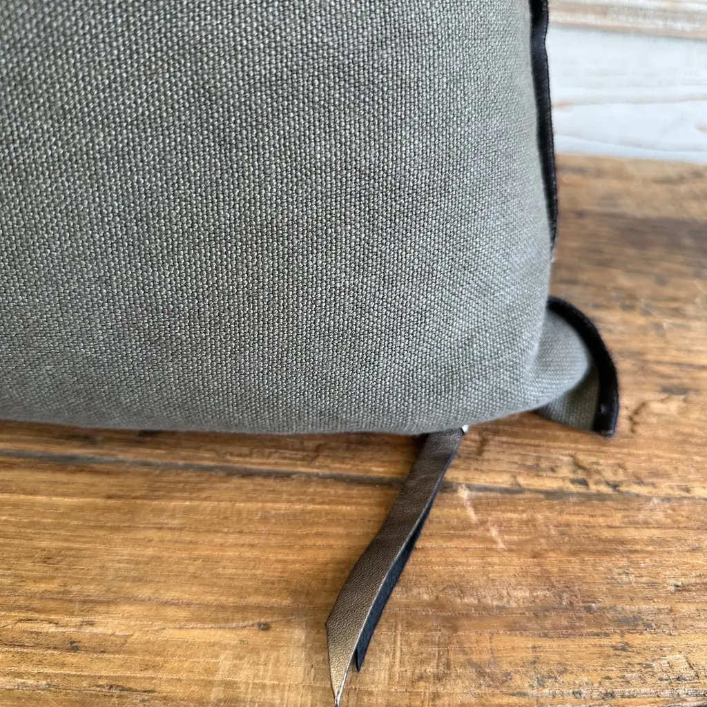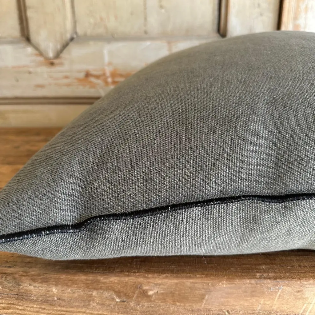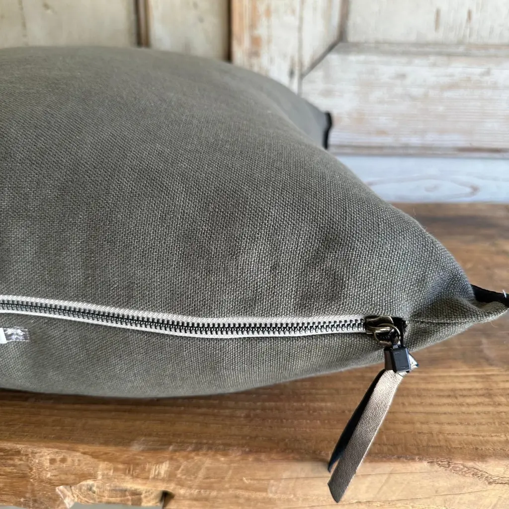 Custom linen blend accent pillow. Color: crocodile a deep green / grey colored nubby textured style pillow with a stitched edge, metal zipper closure. Includes down / feather insert Our pillows are constructed with vintage one of a kind textiles from around the globe. Carefully constructed with the finest textiles, with hidden zipper closure, and overlocked seams. Limited quantities available. If this item is backordered, please allow 6-8 weeks for production.SIZE: 22 ”x 22”.
