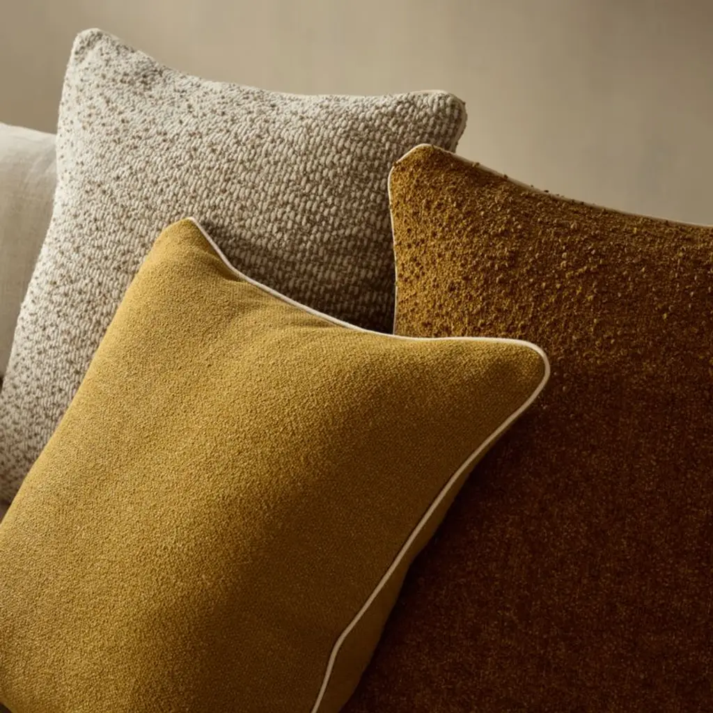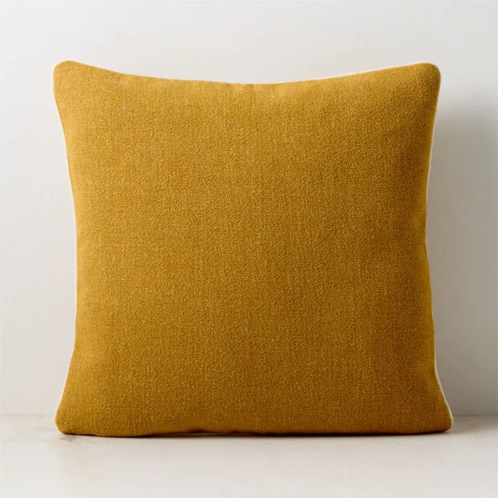 Made in the Lombardia region of Italy, throw pillow showcases a refined solid weave that adds texture in a dull gold tone. Solid white piping offers a crisp contrast, while a clean knife edge, self-back and brass zipper underscore its refined construction. CB2 pillows include a pillow insert in your choice of feather down or down alternative. CB2 exclusive.