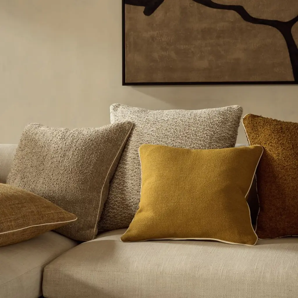 Made in the Lombardia region of Italy, throw pillow showcases a refined solid weave that adds texture in a natural tone. Solid white piping offers a crisp contrast, while a clean knife edge, self-back and brass zipper reflect underscore its refined construction. CB2 pillows include a pillow insert in your choice of feather down or down alternative. CB2 exclusive.