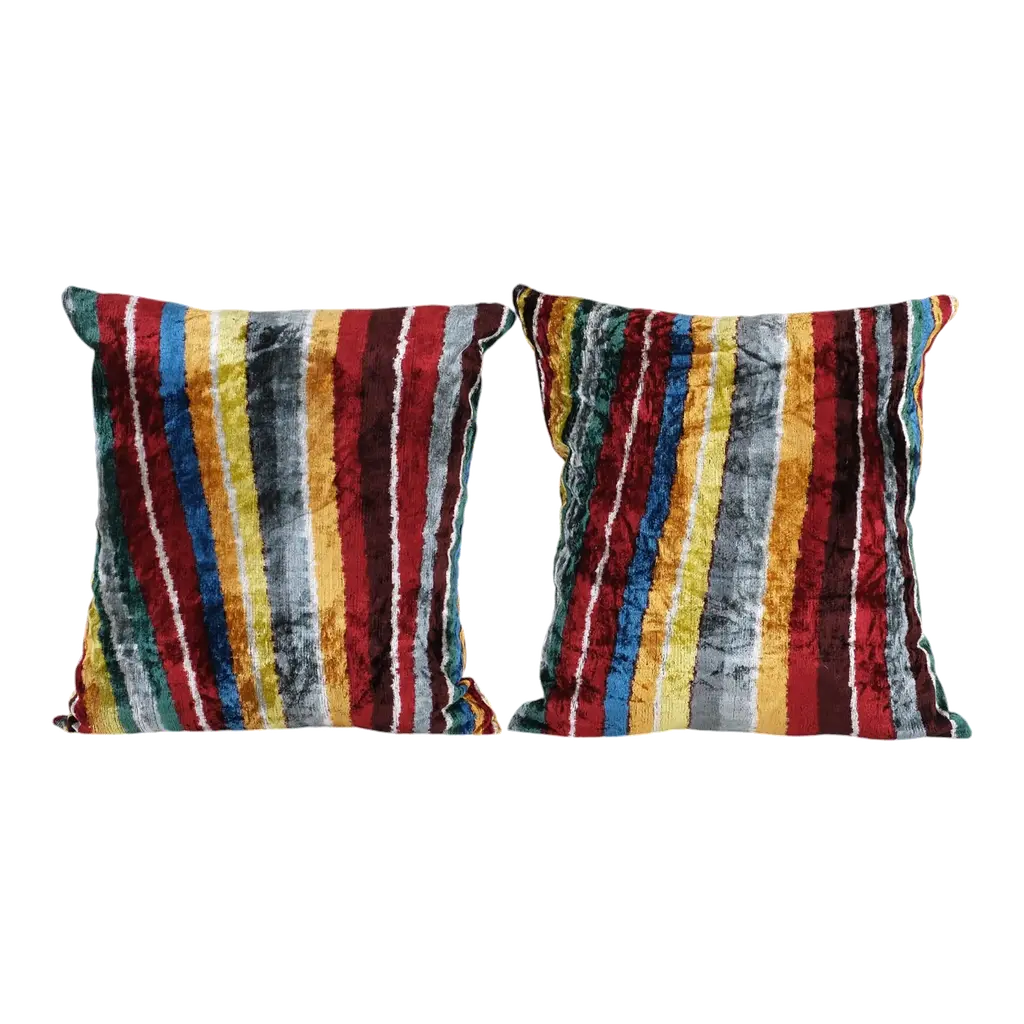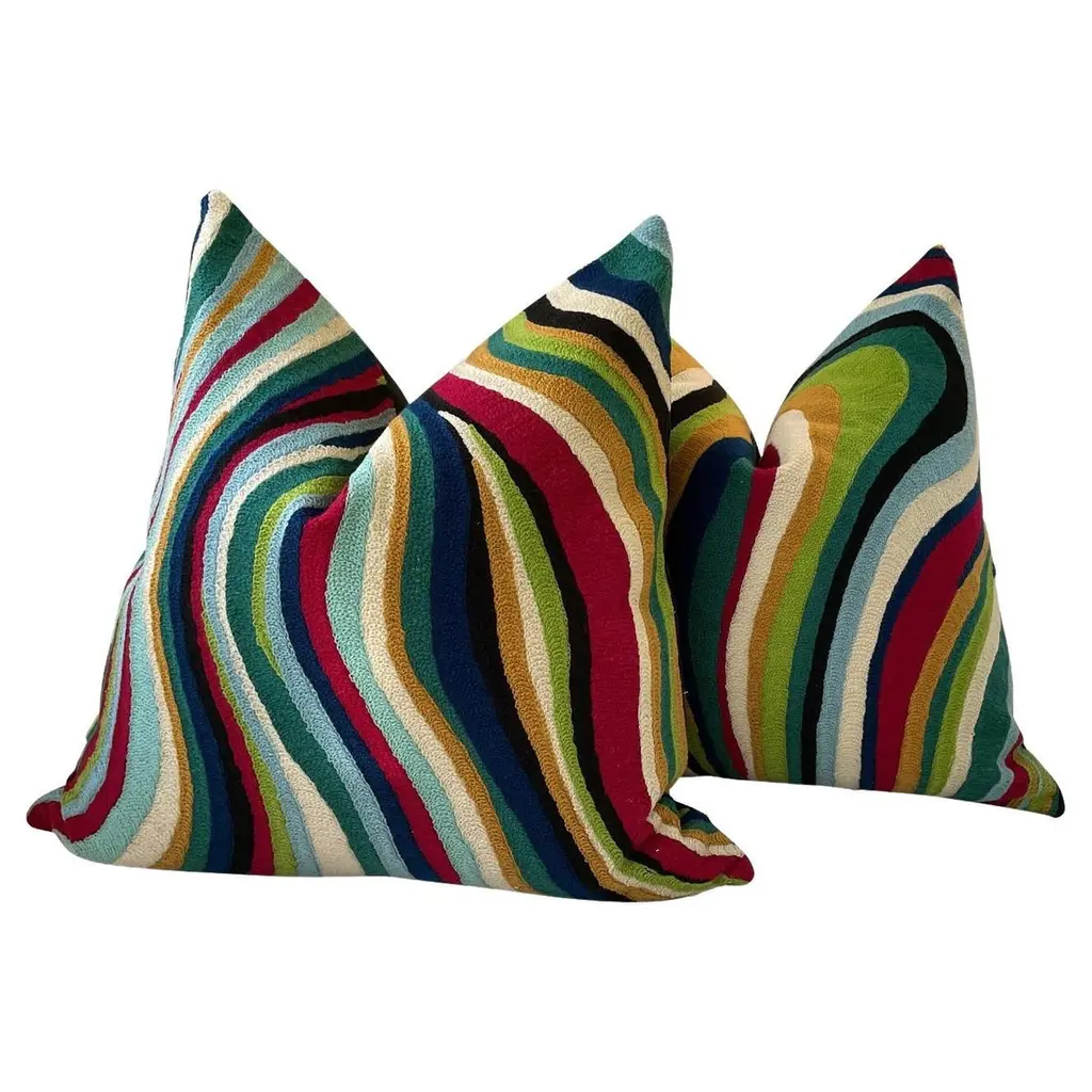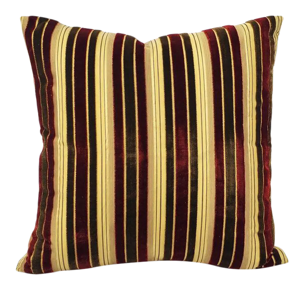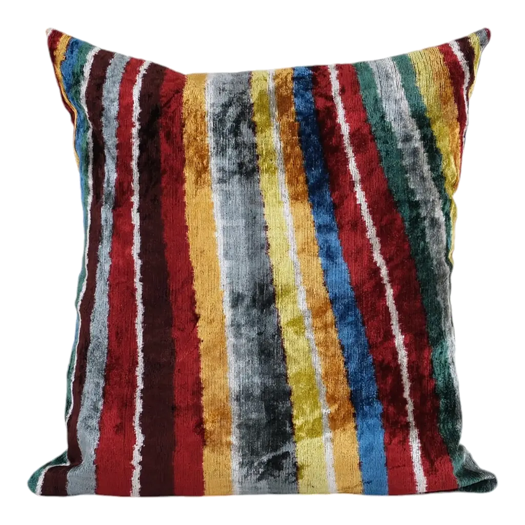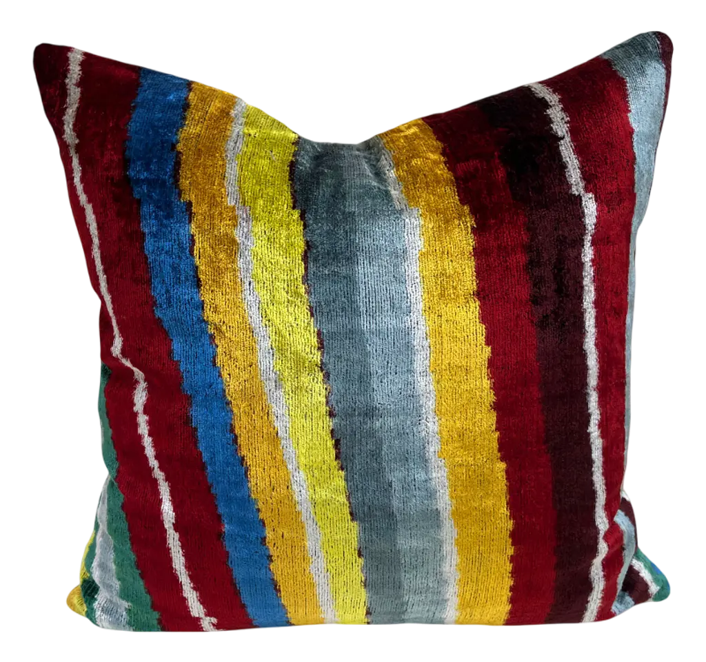 This is a stunning brand new throw pillow made with a colorful rainbow striped fabric. It features a down filled insert and has been carefully stitched to last a lifetime. There is a zipper so the insert can be removed. Both sides are identical. The pillow measures 21" wide x 21" tall x 5" thick in the middle.