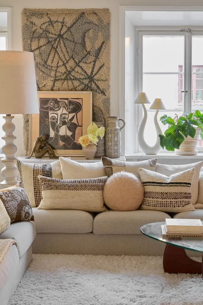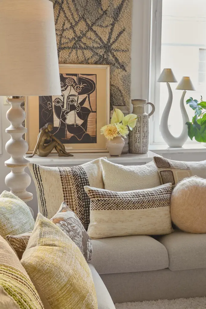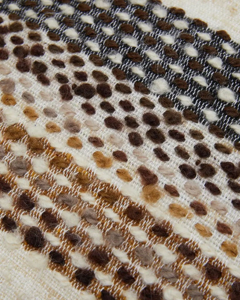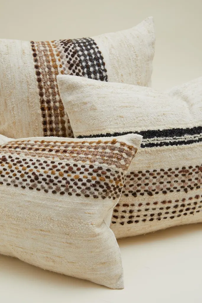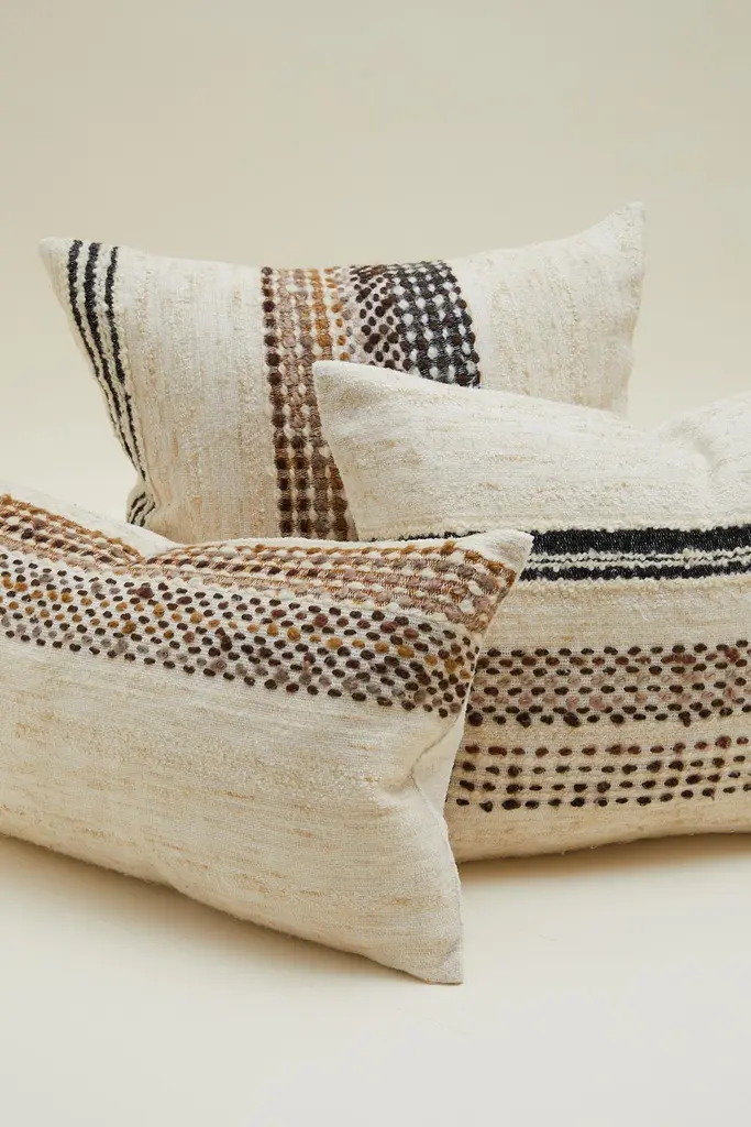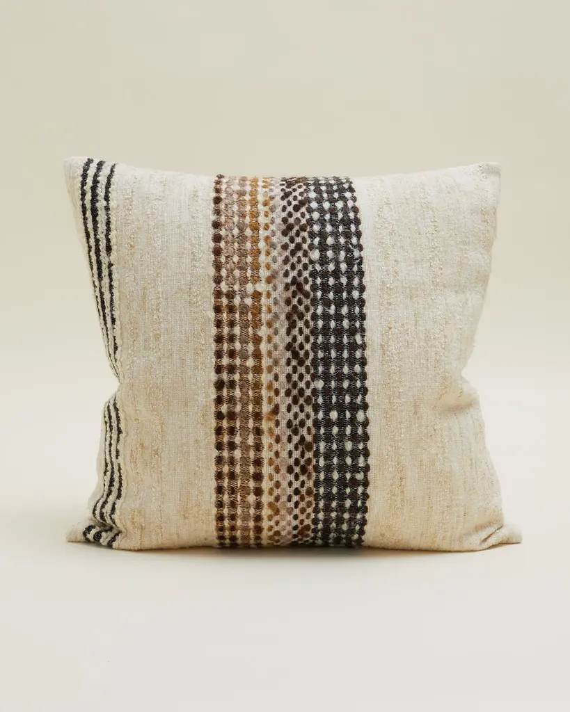 Striped pillow BIBA made from curated vintage Scandinavian wool fabric in Cream, Beige, Brown colors. The fabric have mixed textures. Every pillow is unique. Size: 60x60cmHandmade in Sweden.Composition front: Vintage wool. Made in SwedenComposition back: 39%CO,24%VI, 16%,WO,12%PL,9%Alpaca. Made in ItalyClosure: YKK Zip in brassInsert pillow: 100% European duck feathers included. Made in Denmark, EDAF(European Down and Feather Association) For you as a customer, this means that you are guaranteed that the animals have been treated properly.Care advise: Spot clean, Shake and Air, Dry cleanOur products are handmade, some fabric is pre-used and also using organic materials therefore they are of a delicate nature and may vary slightly between products.