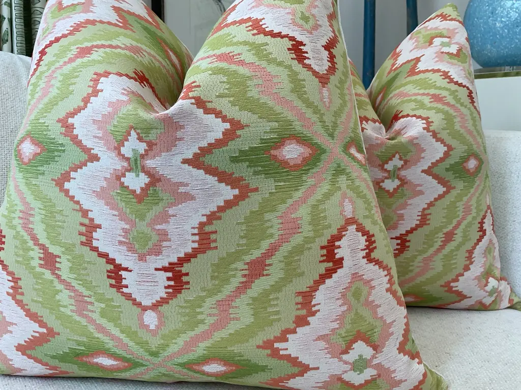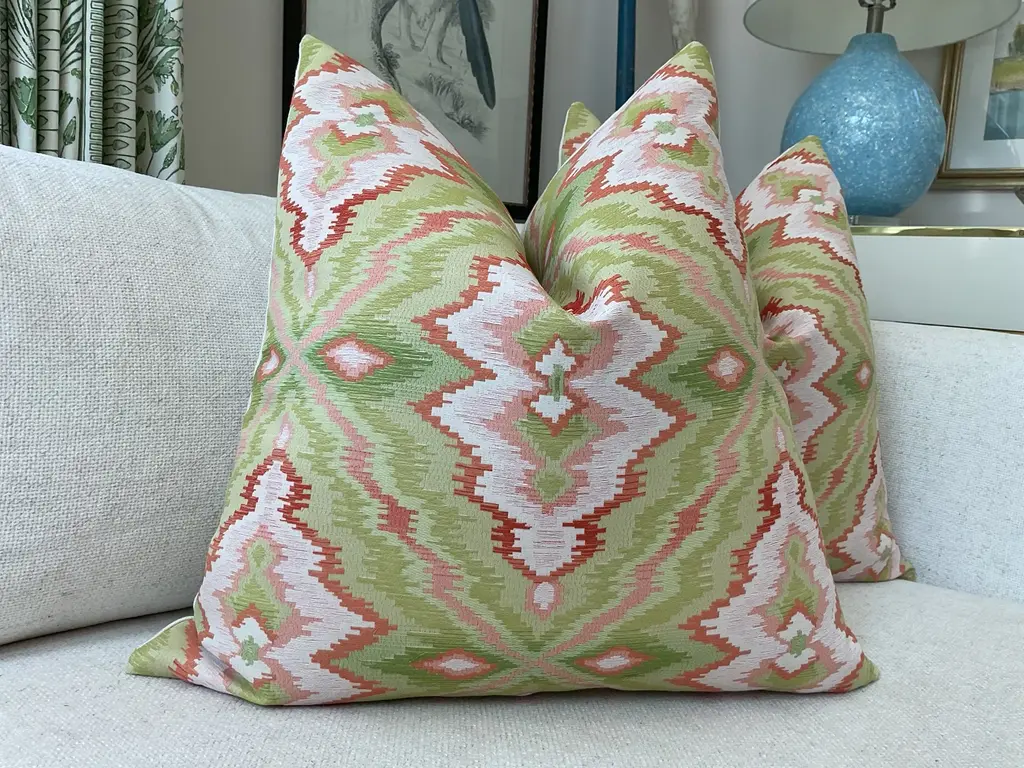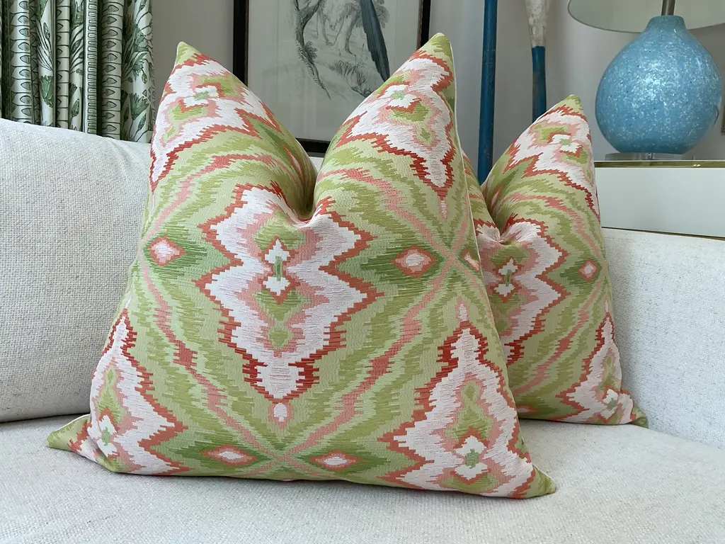Fabulous on-trend fabric from Stroheim. "Hiya Flamestitch" is a glorious rich heavy-weight flame stitch pattern, in vivid lime green, coral, and soft pink. Backed in coordinating ecru linen. The closure is by way of an invisible zipper...These will come backed with complementary creamy linen. Pattern placement will vary but will always feature a centered scene. These will come as a 22" pair with plush down inserts.