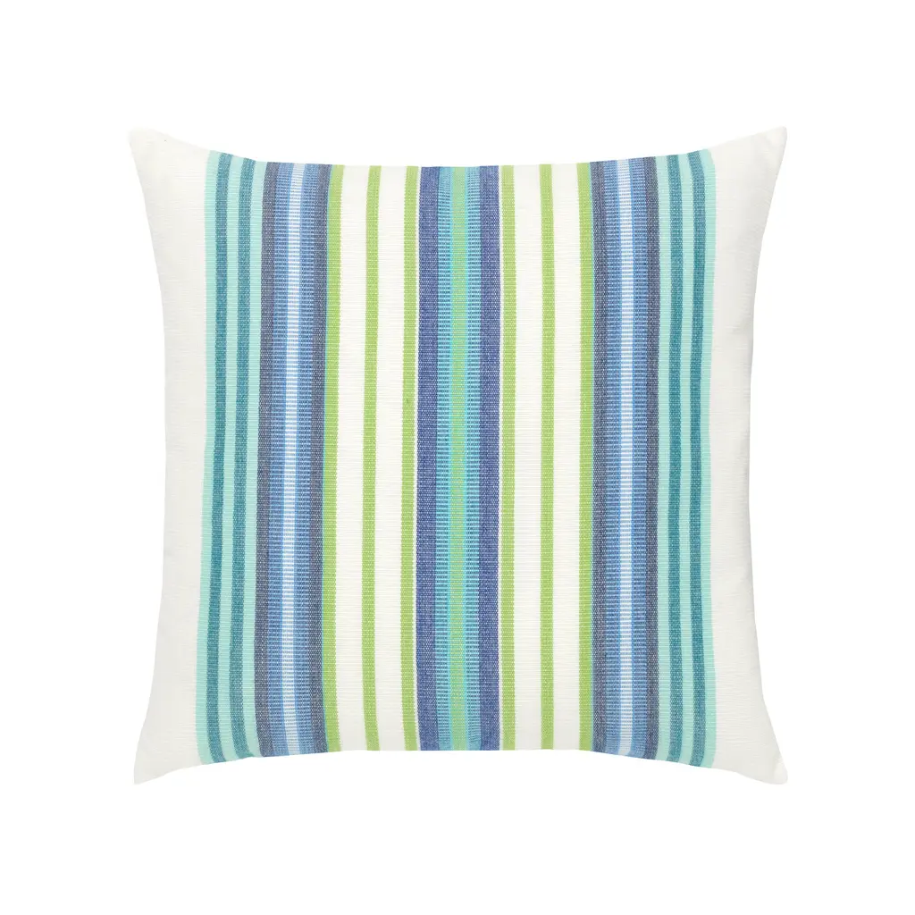 Soft lacey stripes in hues of aqua, cobalt & kiwi on a white ground offer fresh color and texture in an outdoor-safe pillow. Made from Sunbrella yarns, this pillow with resist sun, wind, rain and time. Features