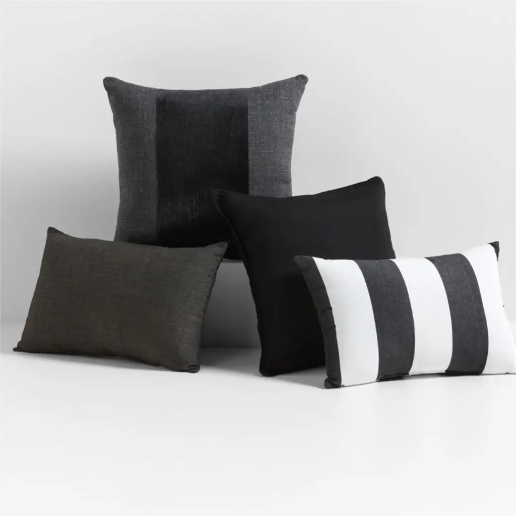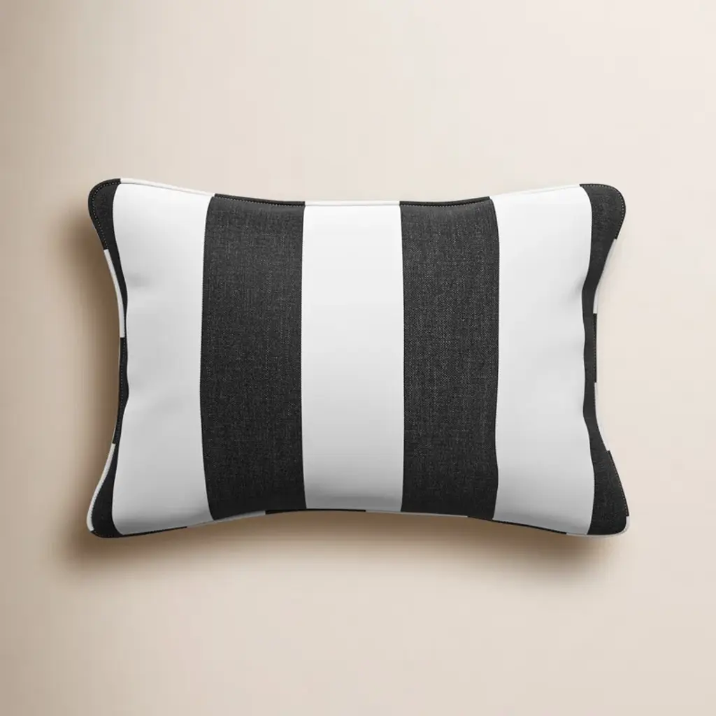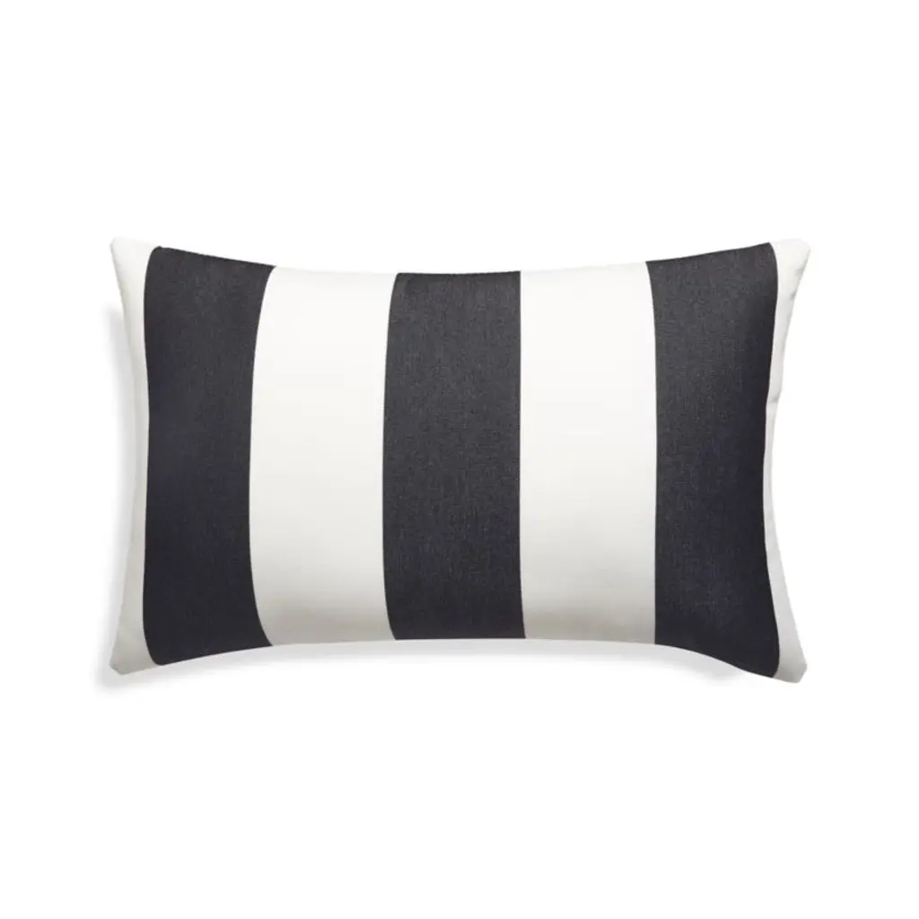 Snuggle up to bold cabana stripes in black and white with our outdoor lumbar pillow covered in Sunbrella fabric. The jaunty pattern, a Crate and Barrel exclusive, evokes classic beach umbrellas and trips to the seaside. Resistant to fading, staining, mold and mildew, the durable yet comfortable pillow gives a graphic pop to solid outdoor furniture and cushions.