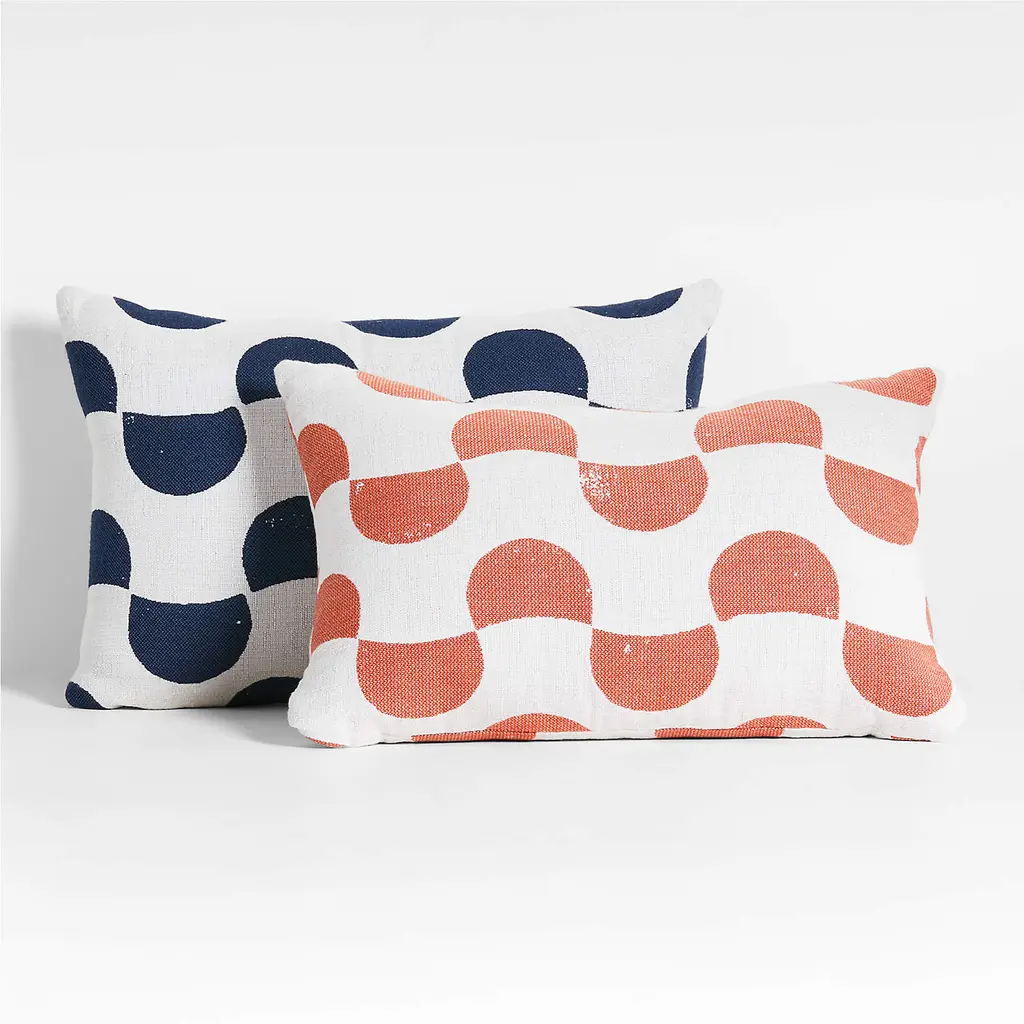 Alternating blue half-moons create a wave-like pattern on our outdoor pillow, bringing a coastal vibe to your porch, patio or pool-side furniture. Designed with subtle distressing for a relaxed feel, the lumbar pillow is covered in weather-resistant Sunbrella fabric in a classic nautical palette of deep blue and bright white. Pair with our solid and striped outdoor pillows in the same colors to layer on the comfort and style.