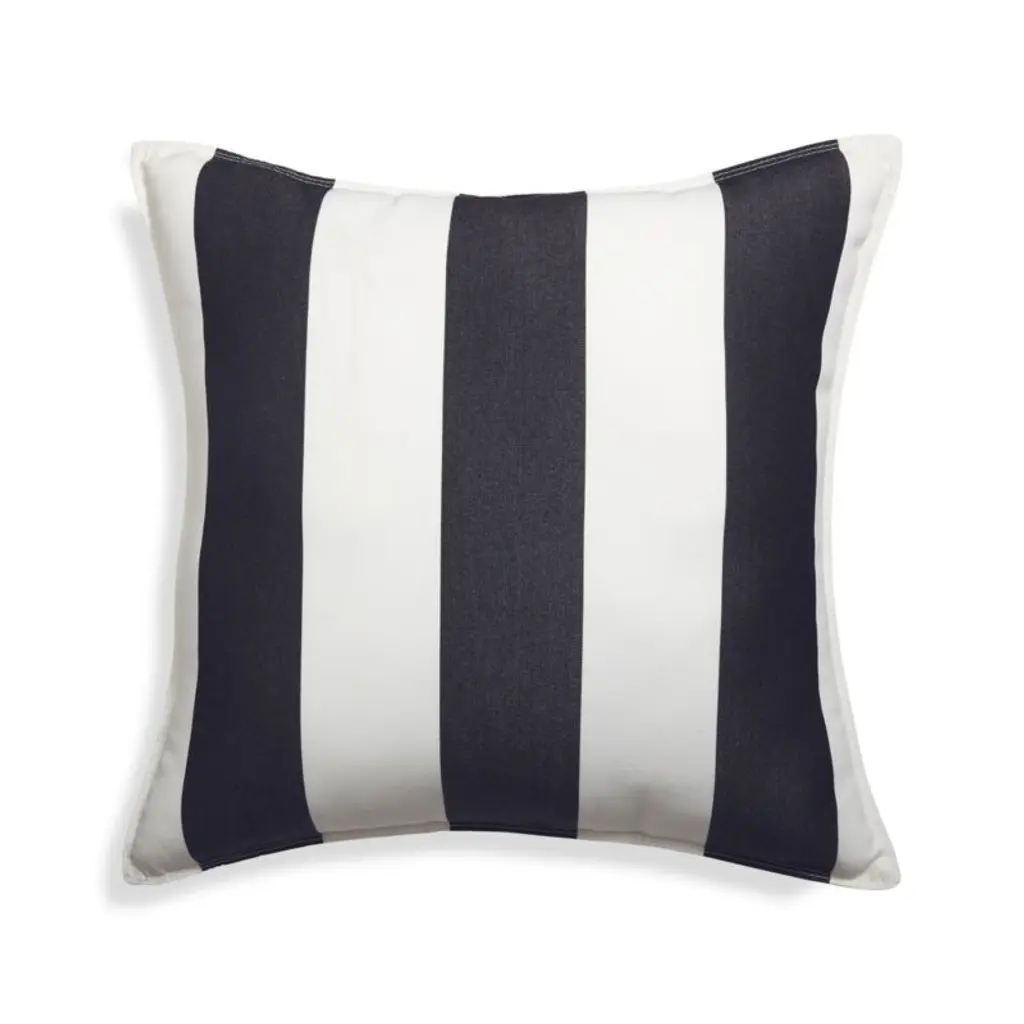Snuggle up to bold cabana stripes in black and white with our outdoor pillow covered in Sunbrella fabric. The jaunty pattern, a Crate and Barrel exclusive, evokes classic beach umbrellas and trips to the seaside. Resistant to fading, staining, mold and mildew, the durable yet comfortable striped square pillow gives a graphic pop to solid outdoor furniture and cushions.