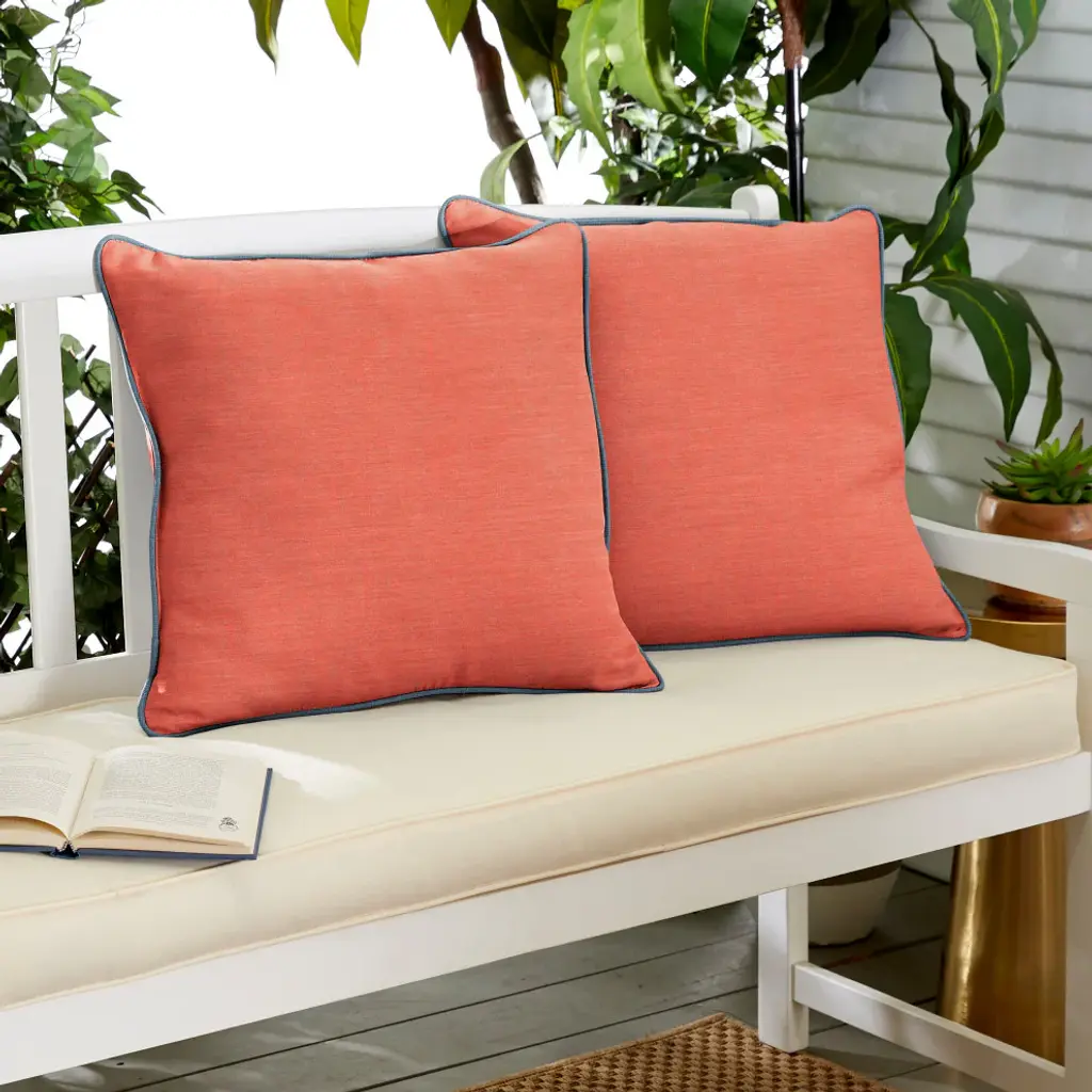 Welcome decorative detail to enhance any seating area with this set of two outdoor square pillows. The contrasting corded trim decorates these pillows with elegant character, allowing them to complement the look and feel of surrounding furniture and features. Filled with 100% recycled fiber, these pillows are durable and supportive through long-term use. The exteriors are UV and fade-resistant to protect against wear and aging when left outdoors.