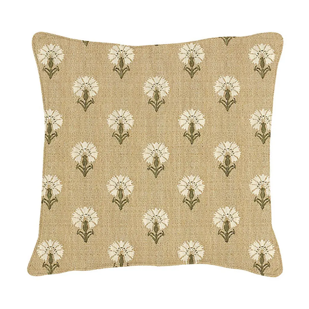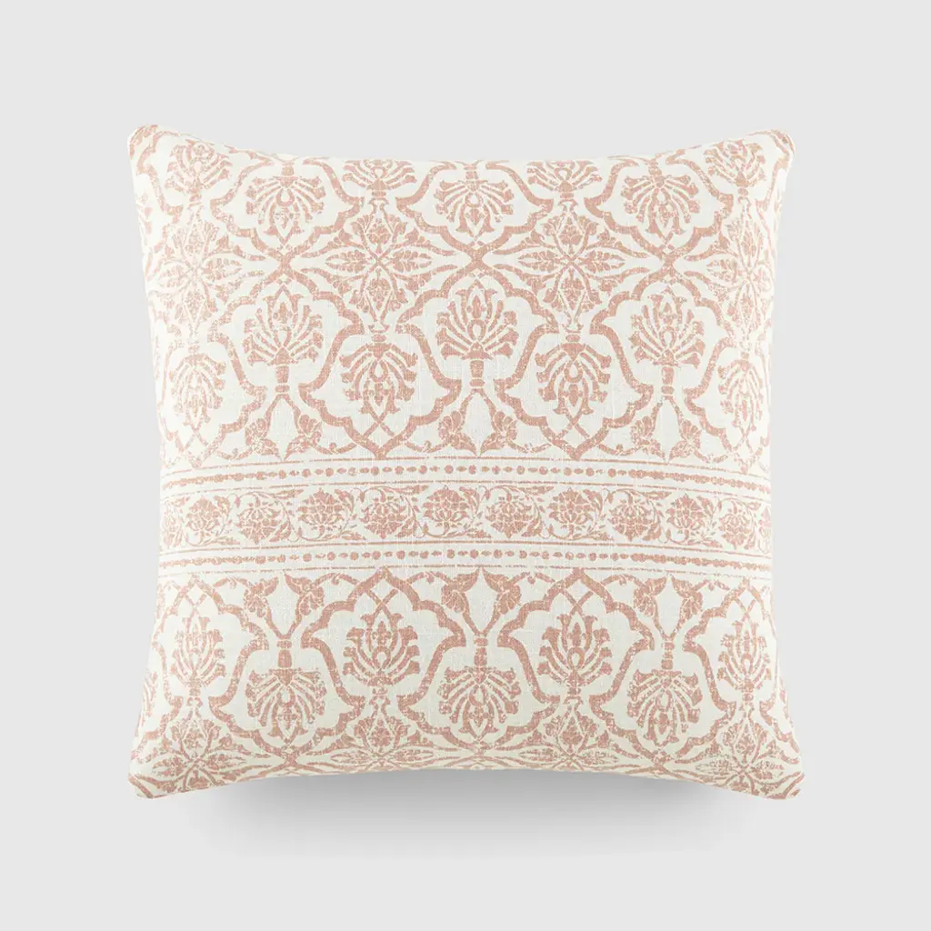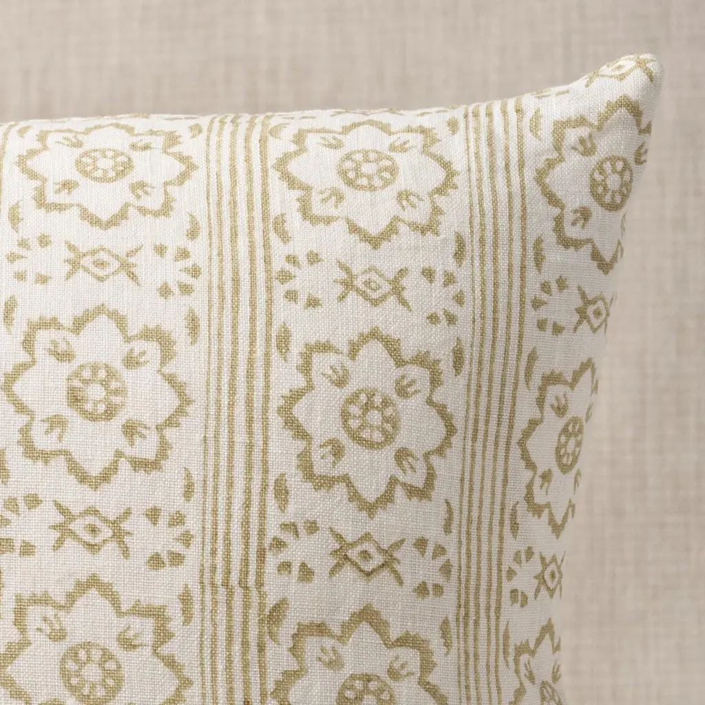 This pillow features Sunda Hand Blocked Print with a knife edge finish. This soft geometric pattern is printed by hand on 100% linen using traditional carved wood blocks. With its appealing combination of stripes and medallions, Sunda Hand-Blocked Print is an easy-to-use medium-scale design that has subtle irregularities and unique handmade charm. Pillow includes a feather/down fill insert and hidden zipper closure.