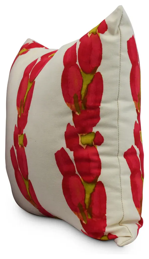Your home will blossom in the light of E By Design''s accentual Market Flowers Sunset Tulip Stripe Red Floral outdoor pillow. With an assortment of floral patterns and warm colors this collection will create an inviting environment on your porch, backyard patio, or any other outdoor space that needs a touch of fresh style!.
