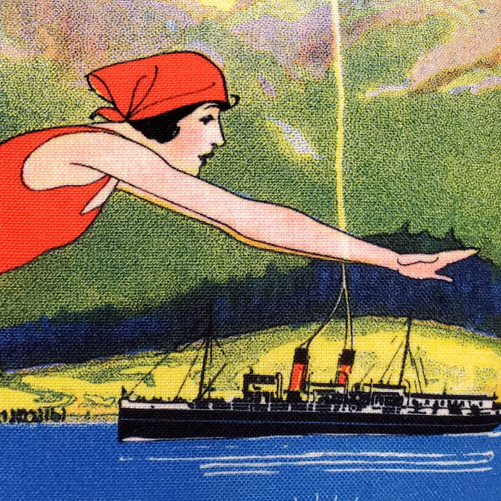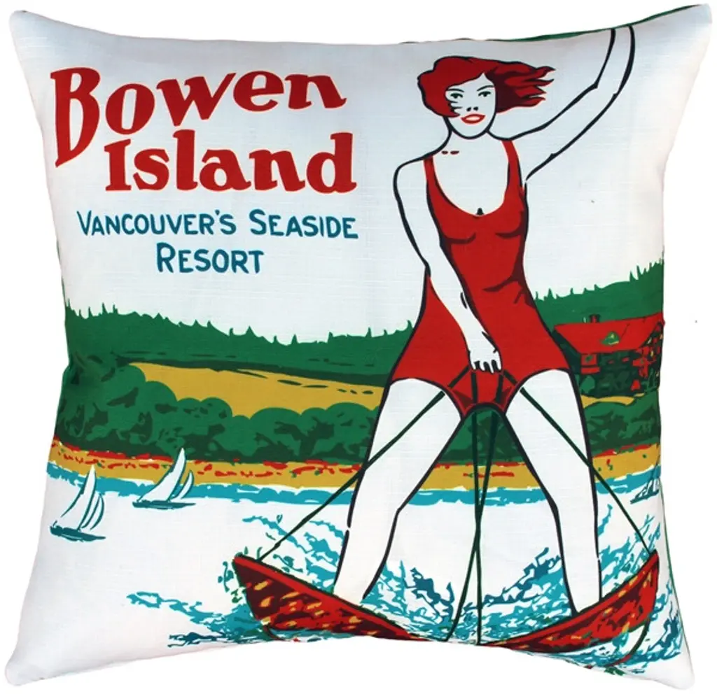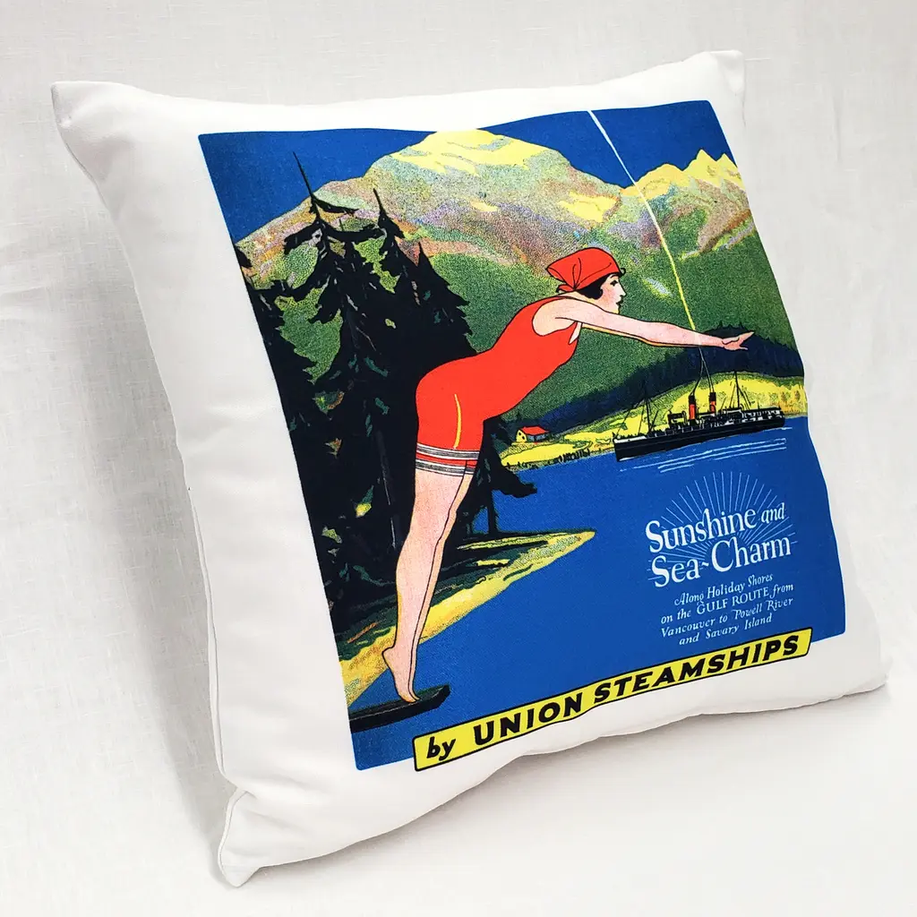This fun and colorful throw pillow features an image adapted from one of several brochures published in the 1930's by the Union Steamship Company to promote local tourism on British Columbia's South Coast. Today, British Columbia's Gulf Islands and Sunshine Coast attract visitors from all over the world. This pillow is made from a soft but durable poly-linen fabric and is one of a collection of three of Union Steamship pillows made by Pillow Decor. Learn more about the Union Steamships that operated on the BC Coast at www.sunshinecoastmuseum.ca. Size: 20"x20" Square Fabric: 100% polyester Design on front only, back in plain white Knife Edge Seams Hidden Color Matched Zipper Closure Hand wash cold, air dry Made in Canada: Designed and made in Pillow Decor's Vancouver workroom.