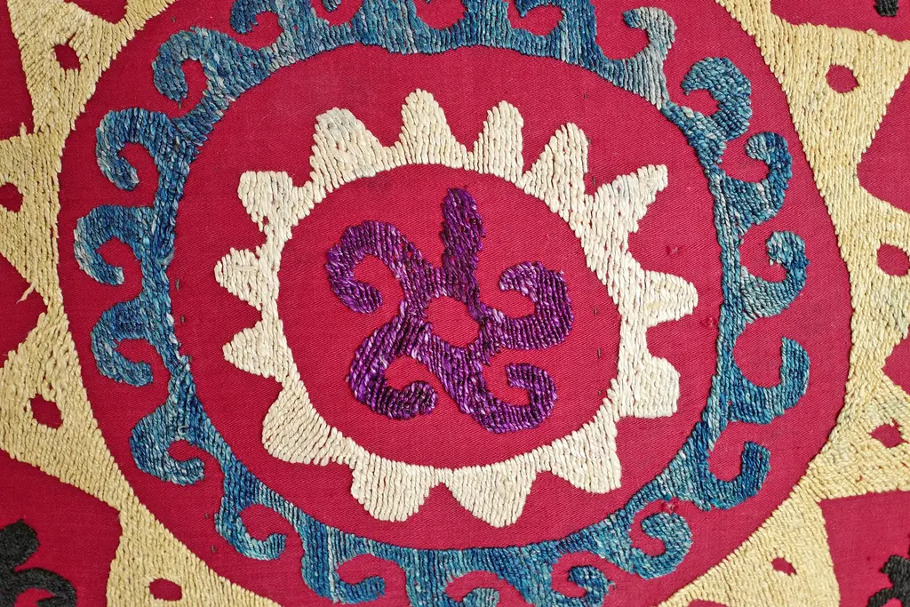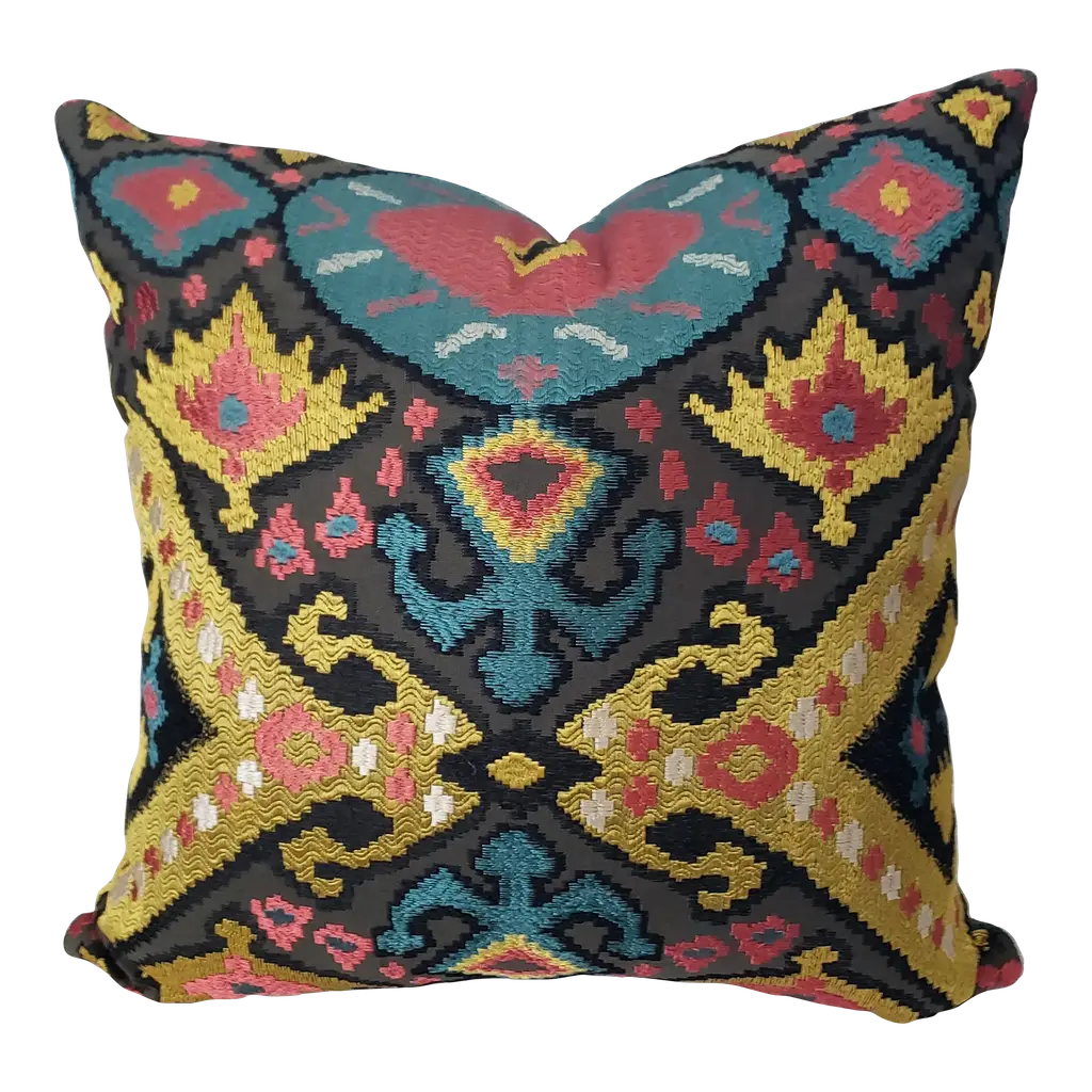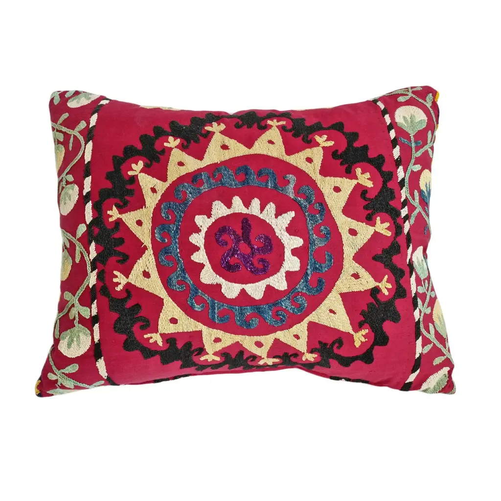 Vintage Suzani embroidered pillow. Zipper enclosure with down insert. Exquisite silk thread hand traditional embroidered panels made by the women of Uzbek. This piece is genuine folk art and not a reproduction machine made piece. Each is unique and in great condition. These bright and fun ethnic pieces bring wonderful quality to any environment. Beautiful minor signs of age.