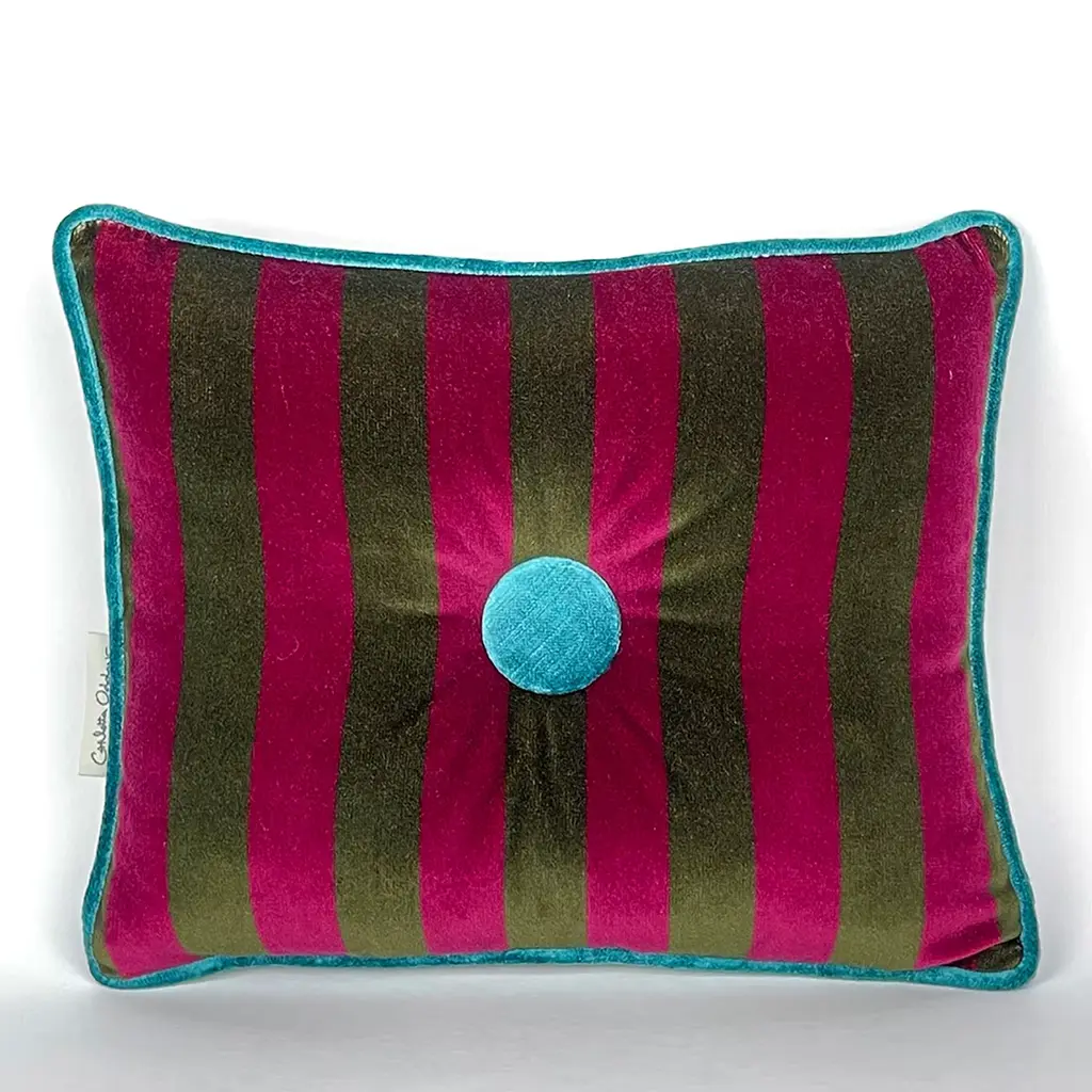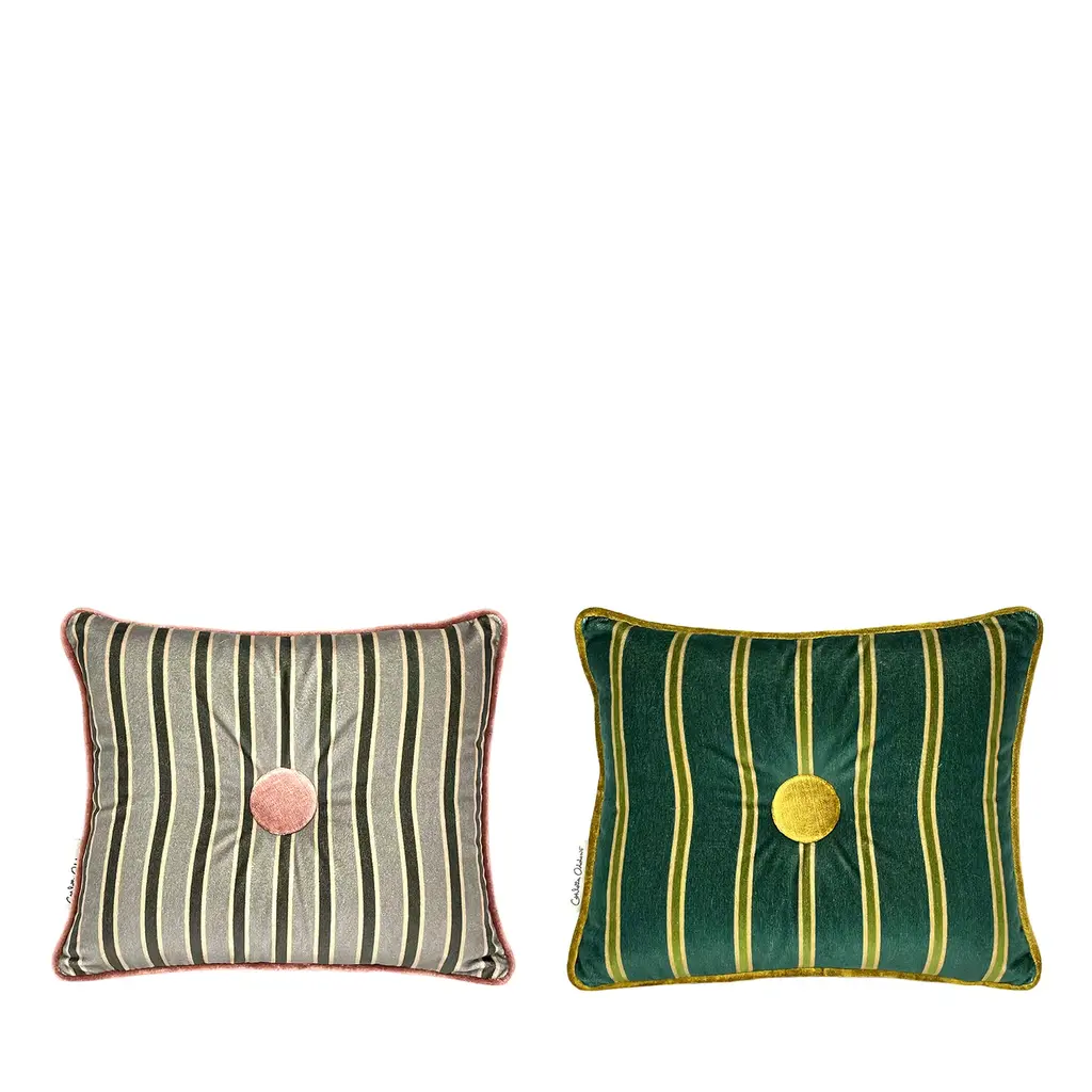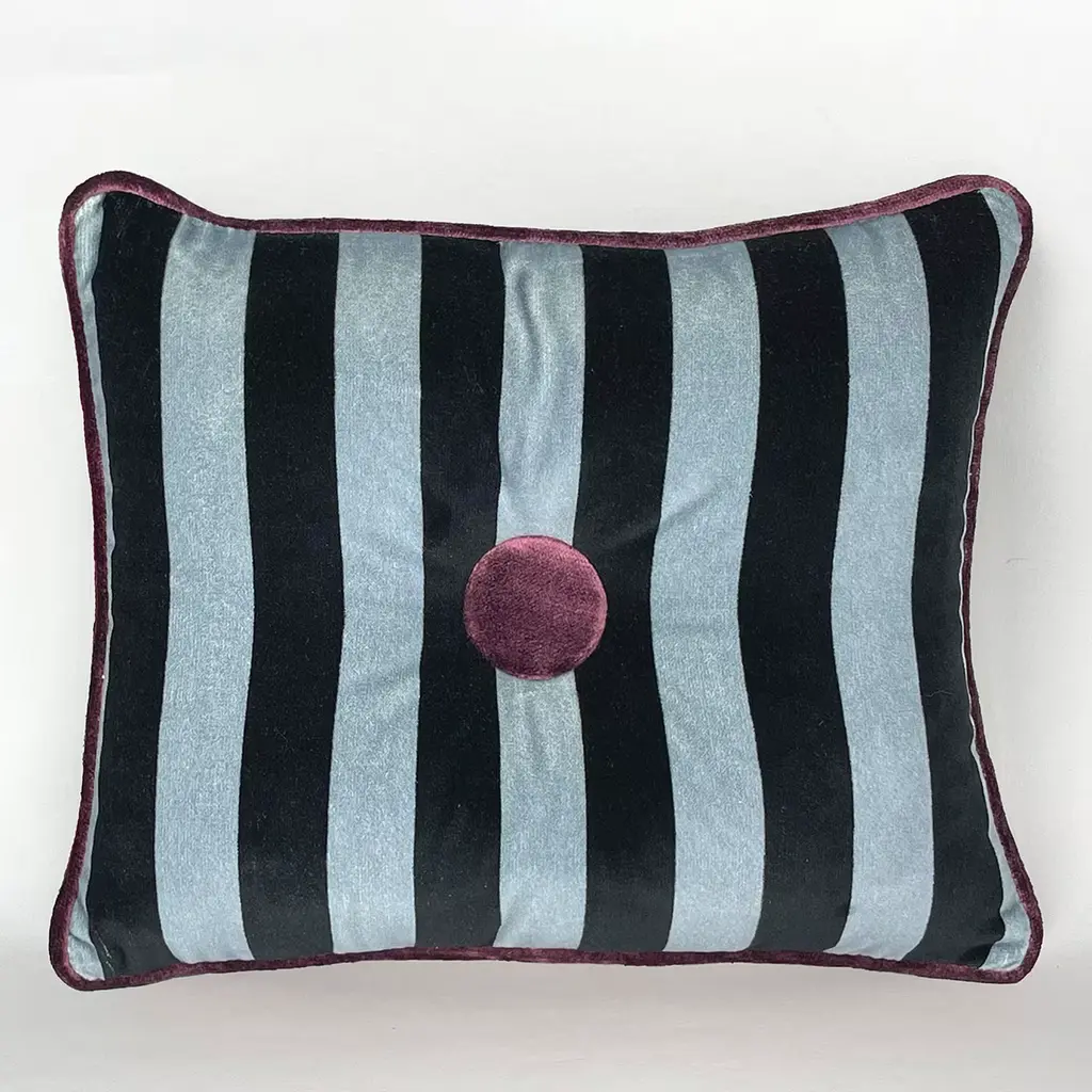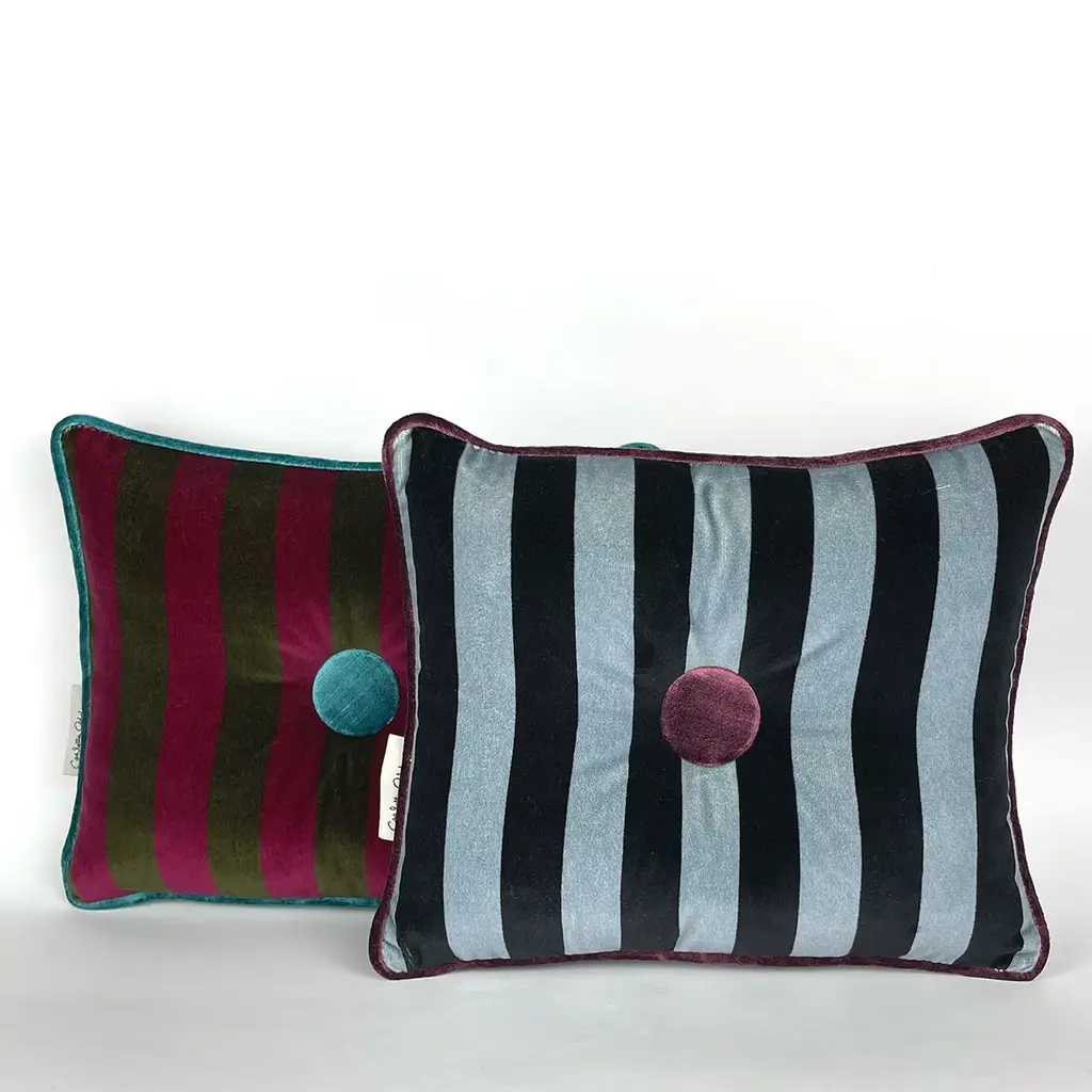 These cotton velvet cushions are not just a functional addition to your living space, they are delightful designs that elevate your décor to new heights of sophistication. The interplay of contrasting colors, the harmonious coordination between the button and border hues, along with the striped pattern, make these cushions a truly distinctive piece. The use of natural tones like forest green and artificial hues like baby jeans creates an unparalleled contrast, ideal for adorning your home.