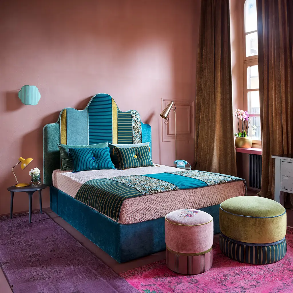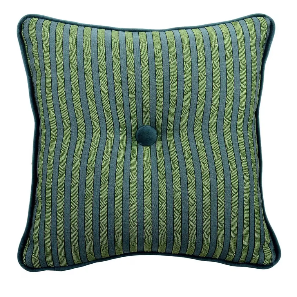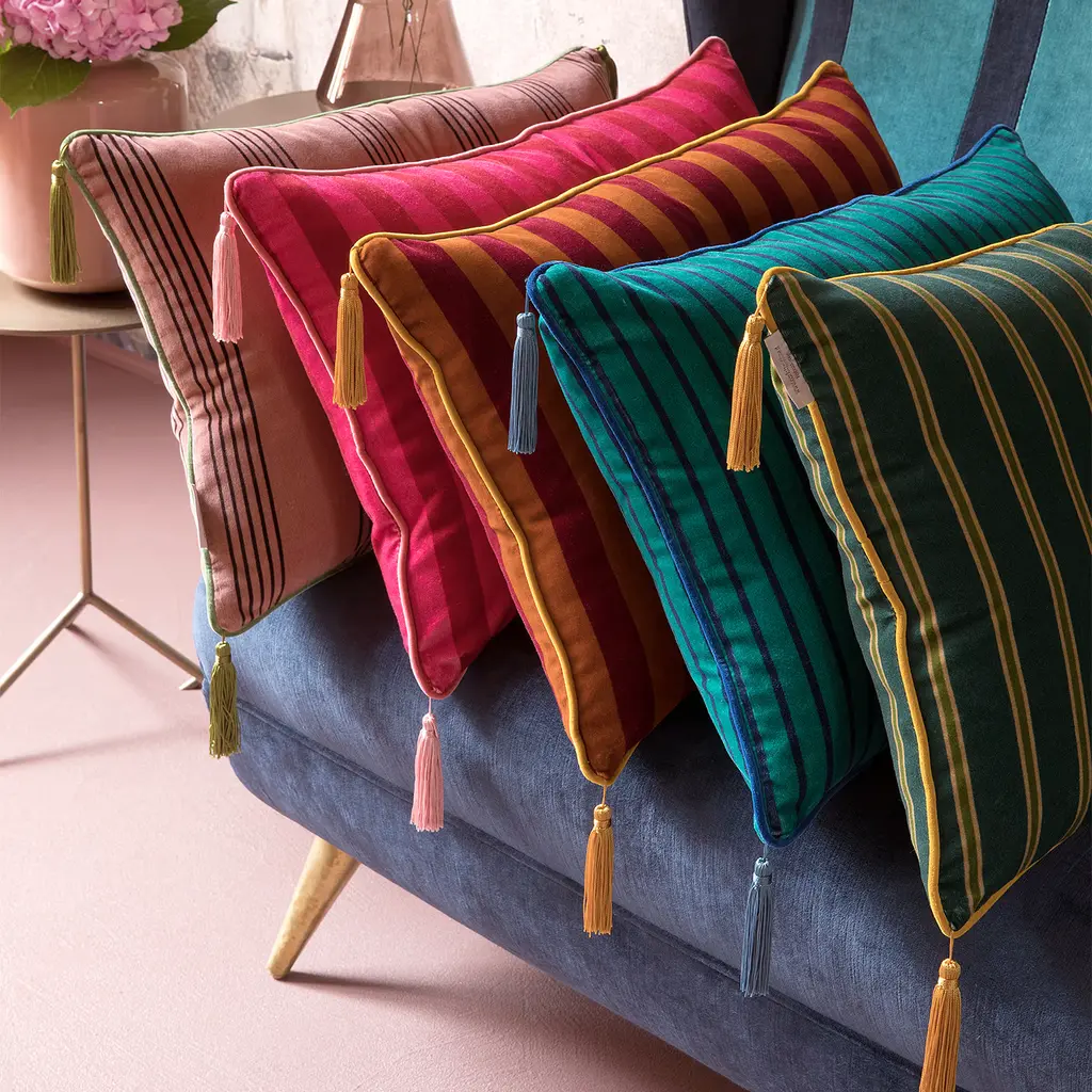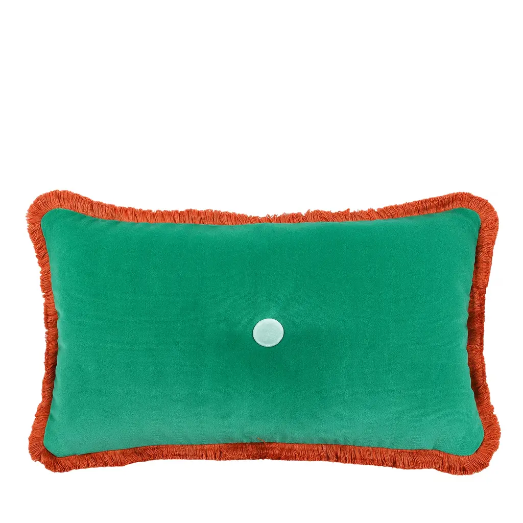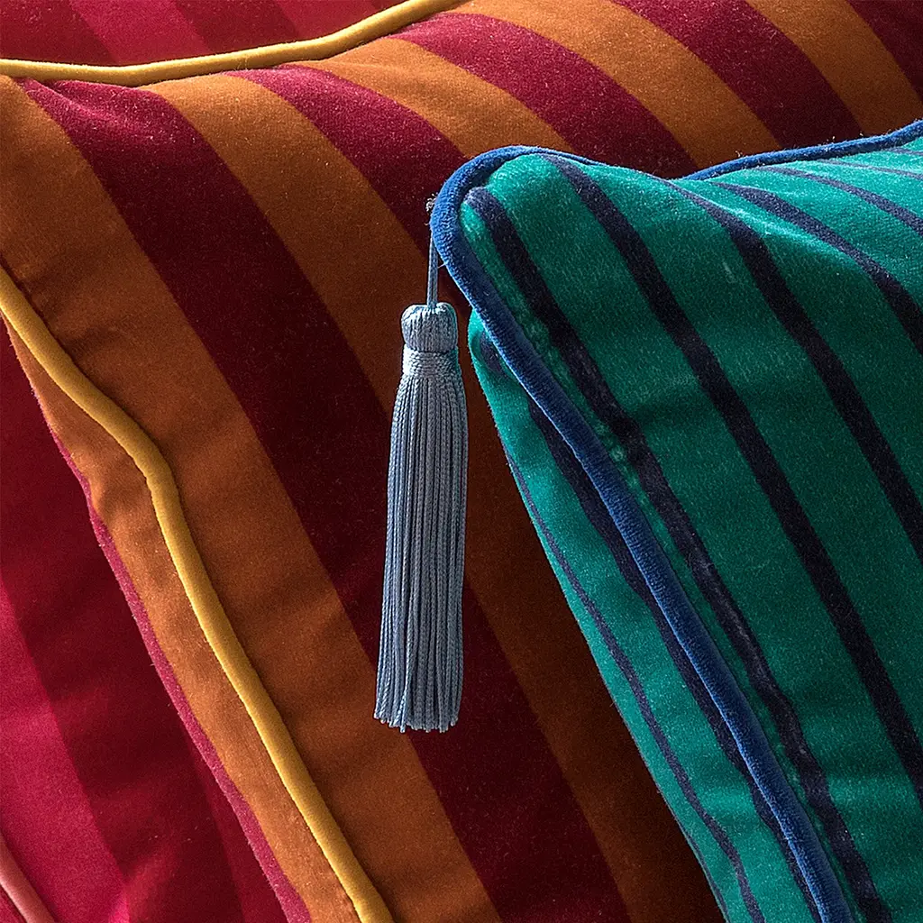 Sartorial value and stylish chromatic choices define this exclusive rectangular cushion from the Sweet Pillow Collection. An eye-catching addition to a beige-toned sofa or bed, it features a soft teal cotton velvet cover adorned with blue stripes matching the piping while the central button hints at the piece's generous inner stuffing. Tassels on the corners enliven the design.