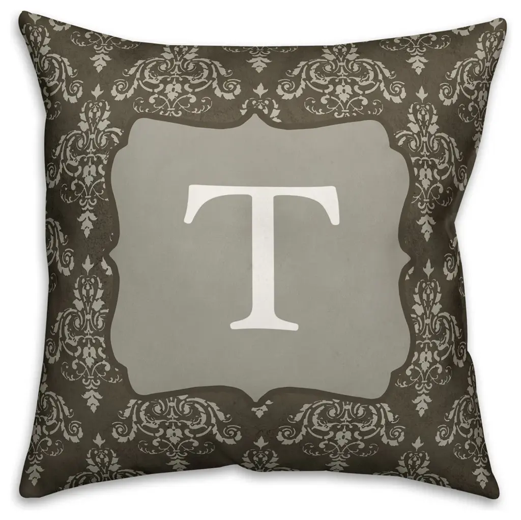 T Dark Gray Damask Monogram Spun Poly Pillow, 18x18