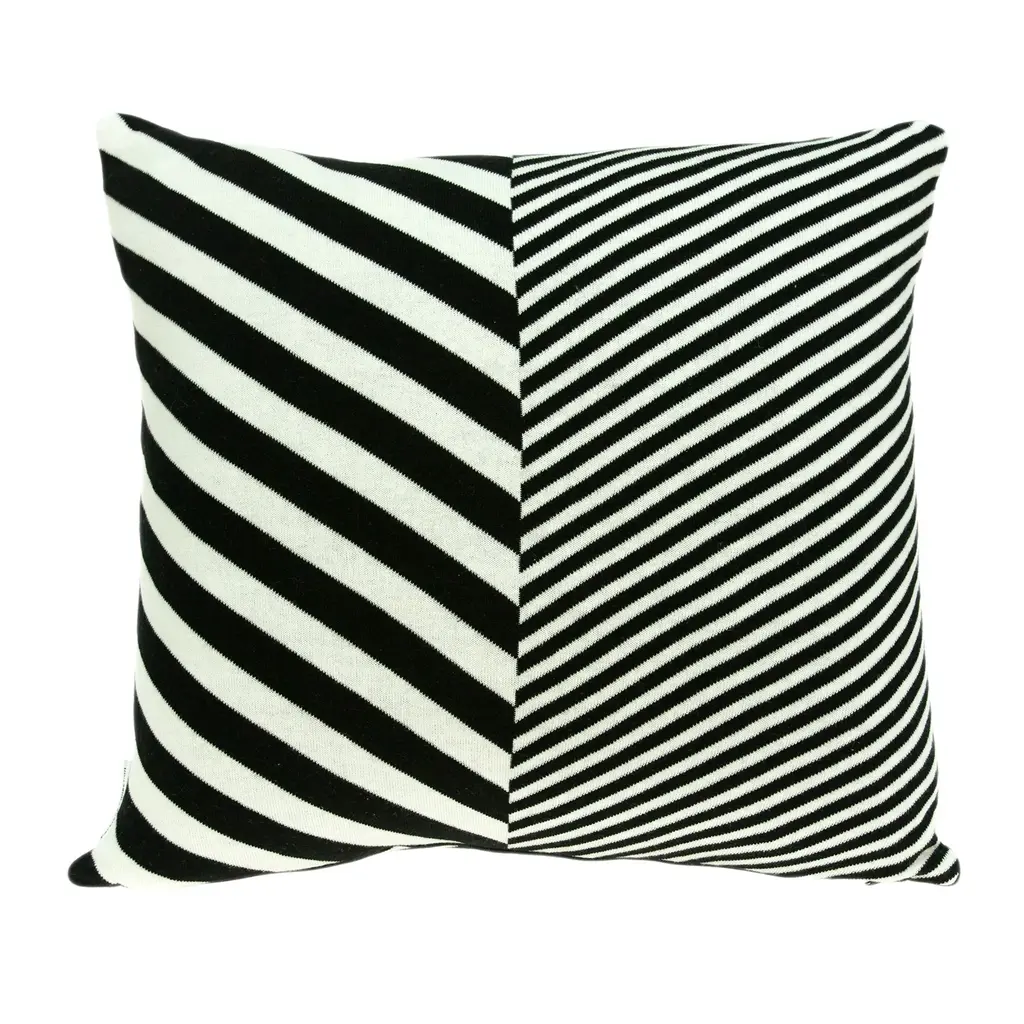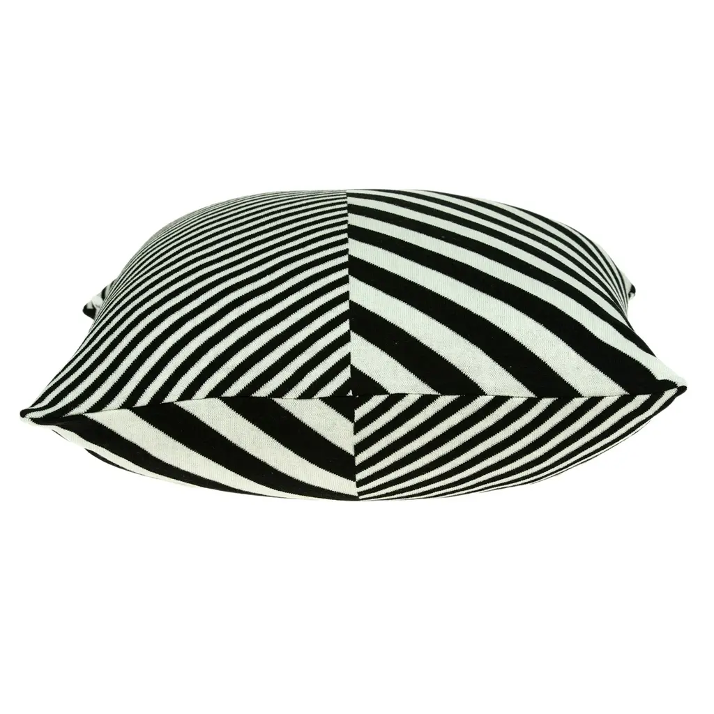 Elevate your space with effortless style with this square throw pillow. Featuring a chic black and white tapered stripe design, this pillow complements neutral and farmhouse-style interiors while making a subtle statement. Designed to seamlessly blend timeless tradition with modern fashion, this meticulously knitted accent piece adds warmth, texture, and sophistication to any room. Product Features: Color(s): white and black Showcases a knitted tapered stripe pattern Design is on both sides Removable cover with zipper closure for easy cleaning Care instructions: dry clean only Recommended for indoor use Dimensions: 18"H x 18"W x 5"D Material(s): Shell: cotton Filling: polyester
