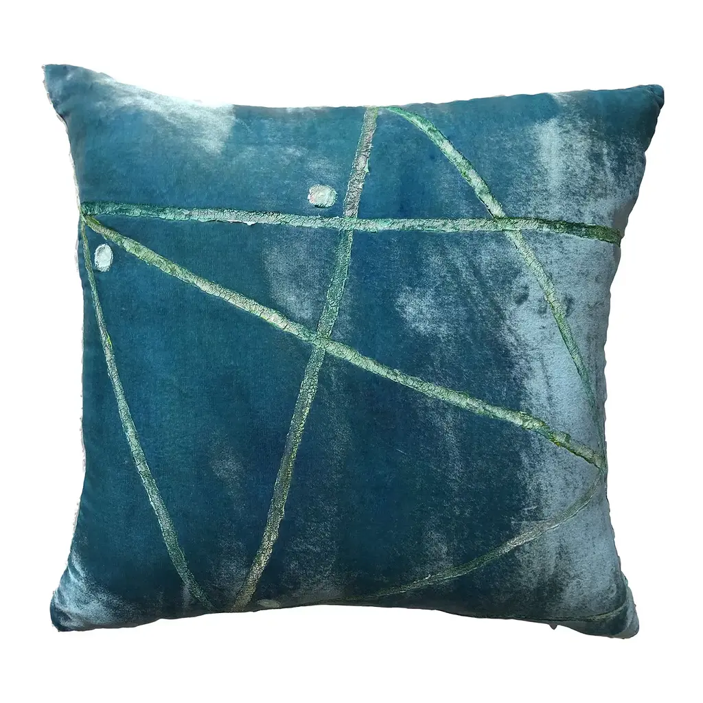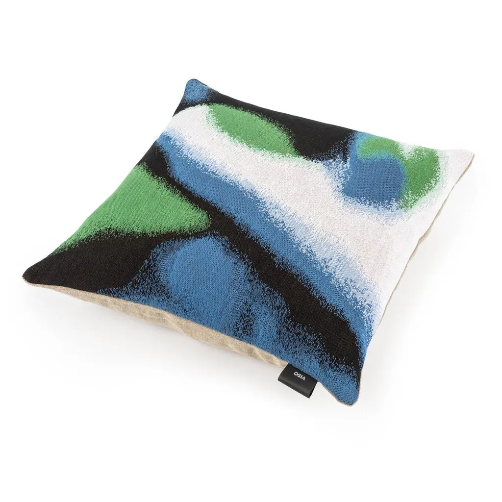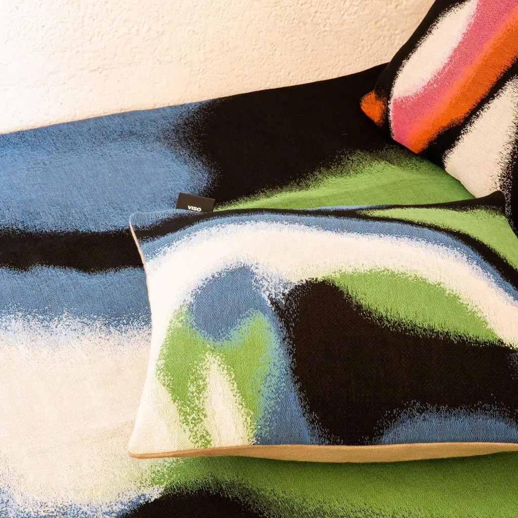 These tapestry series turns textile to art. A meticulously crafted three-layer Jacquard produced in France, these pillows are finished expertly by hand to create a subtle three-dimensional effect. In either a groovy pink and red color combination or the complimentary blue and green scheme, the abstract, optical design oscillates between playful and elegant, funky and chic. The immaculate attention to detail and the high-density weave elevates this tapestry pillow to the quality of fine art and adds colorful finesse to your couch or bed. Backed in French linen in beige.