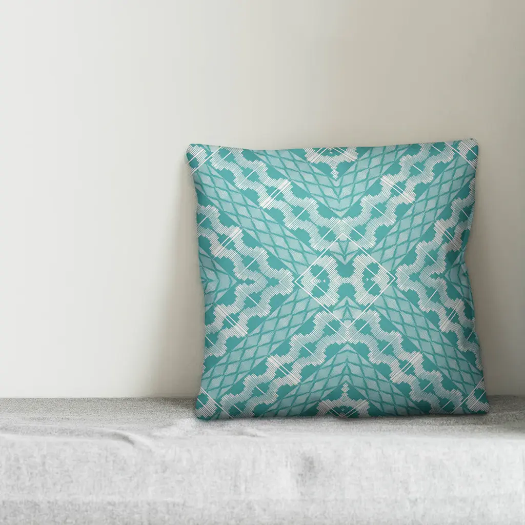 Spruce up your outdoor seating with this teal and white outdoor throw pillow, featuring a fun Boho pattern. The water and mildew resistant heavy weight stretch material provides great color definition and quality. The result is a unique pillow that is sure to add some personality to your outdoor living space!
