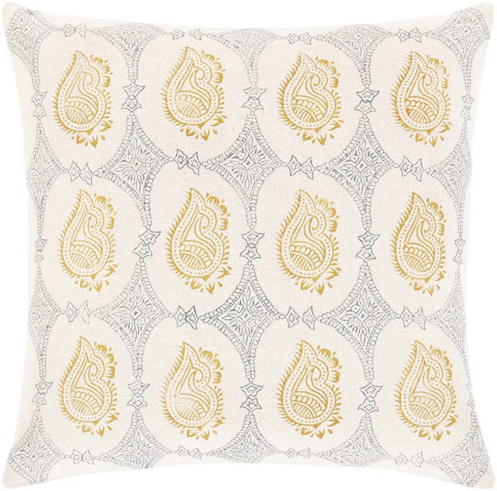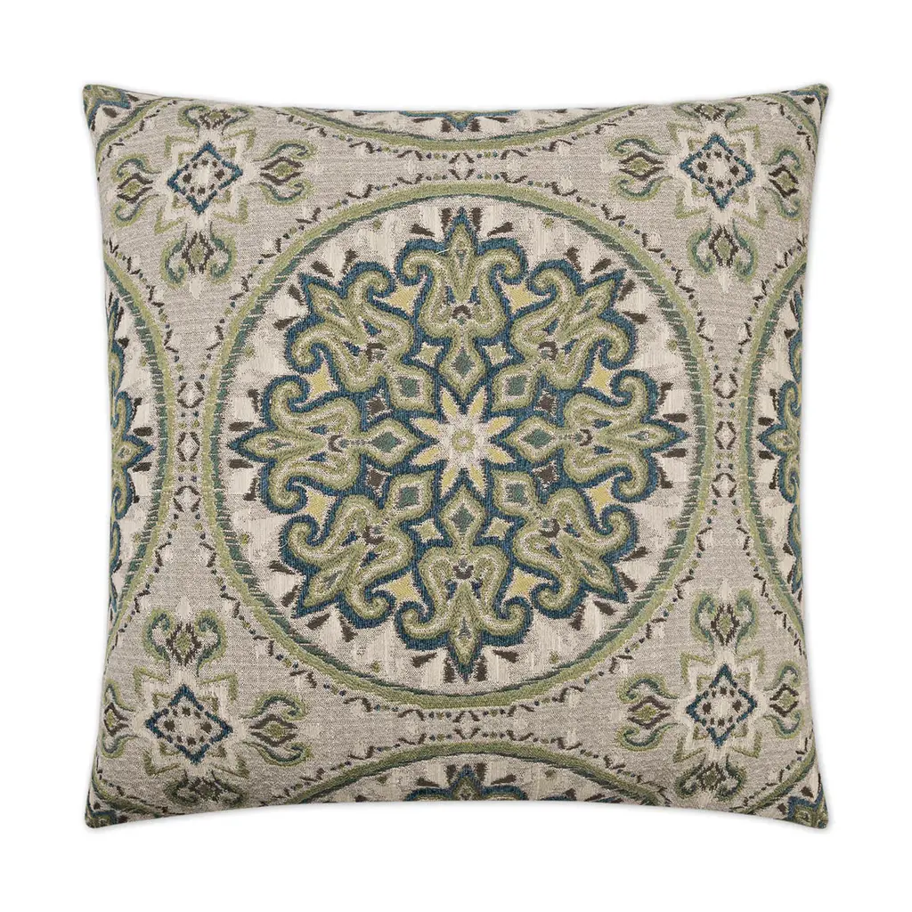 This pillow features Temara Embroidered Print with a knife edge finish. This exotic beauty is printed by hand on a linen-jute ground and embellished with hand-guided embroidery. Back of pillow is Antique Linen Velvet II. Pillow includes a feather/down fill insert and hidden zipper closure.