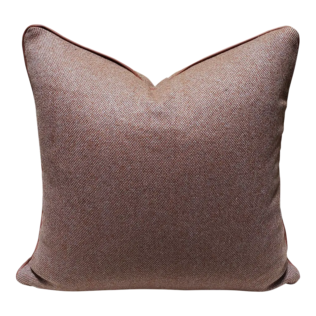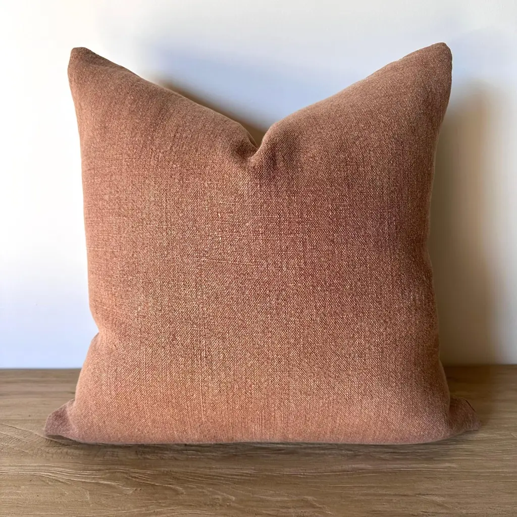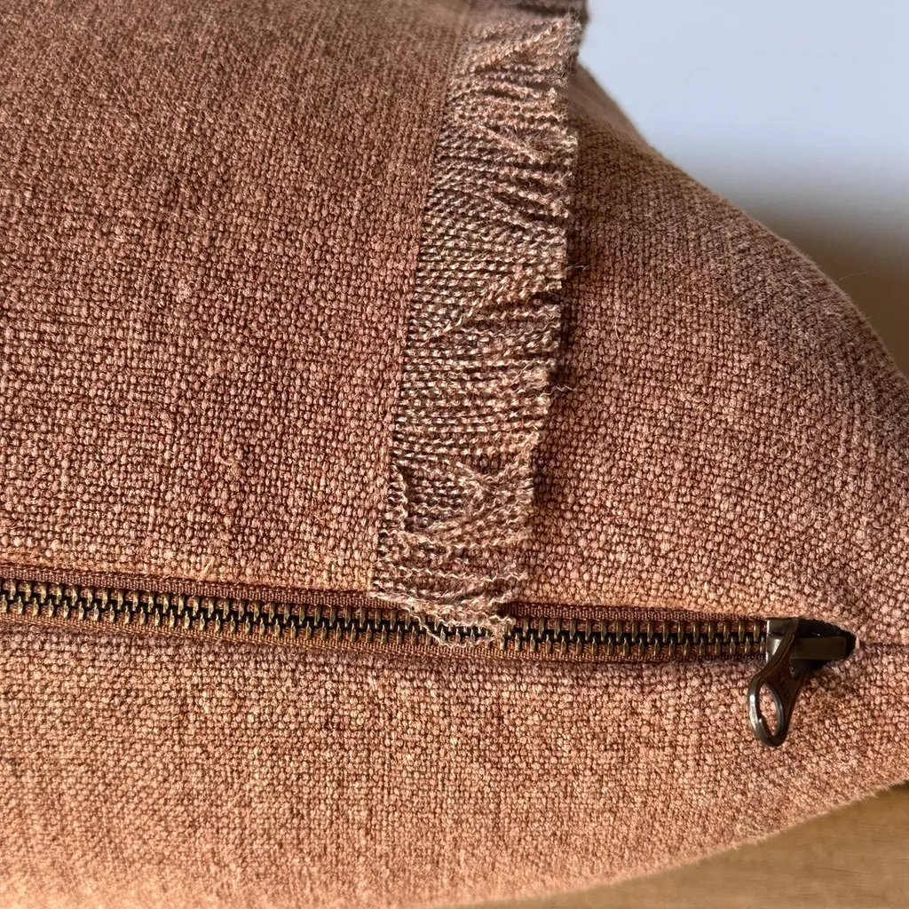 The Fringe CollectionSewn with a brass zipper closure and overlocked seams, this nubby linen textured pillow has a rust, brown tone. A perfect accent pillow to blend seamlessly into your decor.Down/Feather insert is included.22″ x22″100% Linen500 gram / m236.5 oz / yd2shrinkage 3%Care: Dry Cleaning Recommended. Can be machined washed cold/ lay flat to dry.