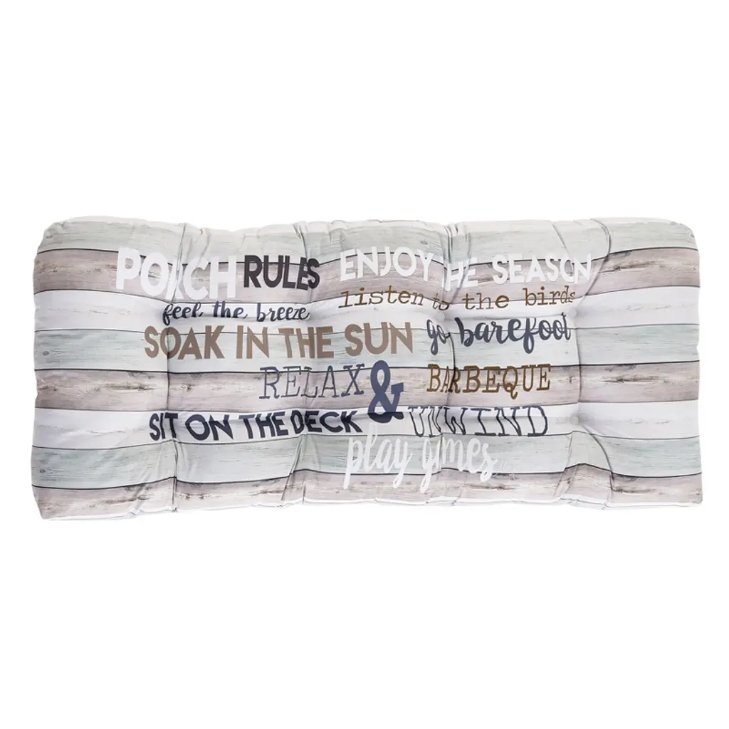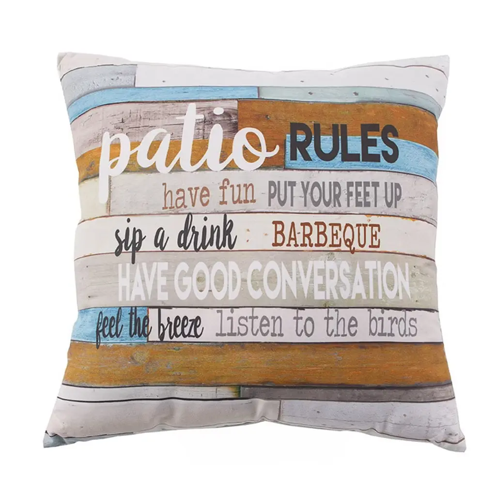 Add comfort and a decorative touch to a patio chair with this throw pillow. The tongue-in-cheek list of Patio Rules makes it a fun addition to your home décor. In a variety of fonts and colors the rules are printed on a wood-look background of different colored slats. The pattern features colors of teal, brown, yellow and green that will coordinate with almost any patio décor. You can also use this patio pillow indoors, where its wood slat background will enhance your farmhouse décor. 16" sq. Polyester with polyfill. Spot clean.