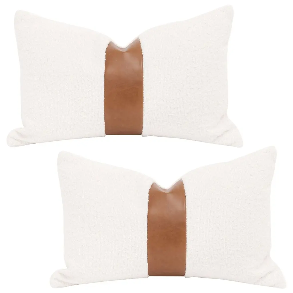The Split Decision 20" Essential Pillow, Set Of 2 Livesmart Boucle-Snow, Whiskey Brown Top Grain Leather Stripe