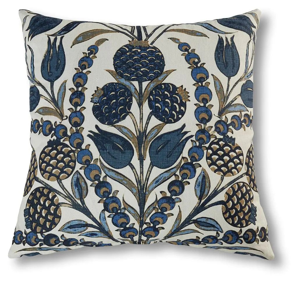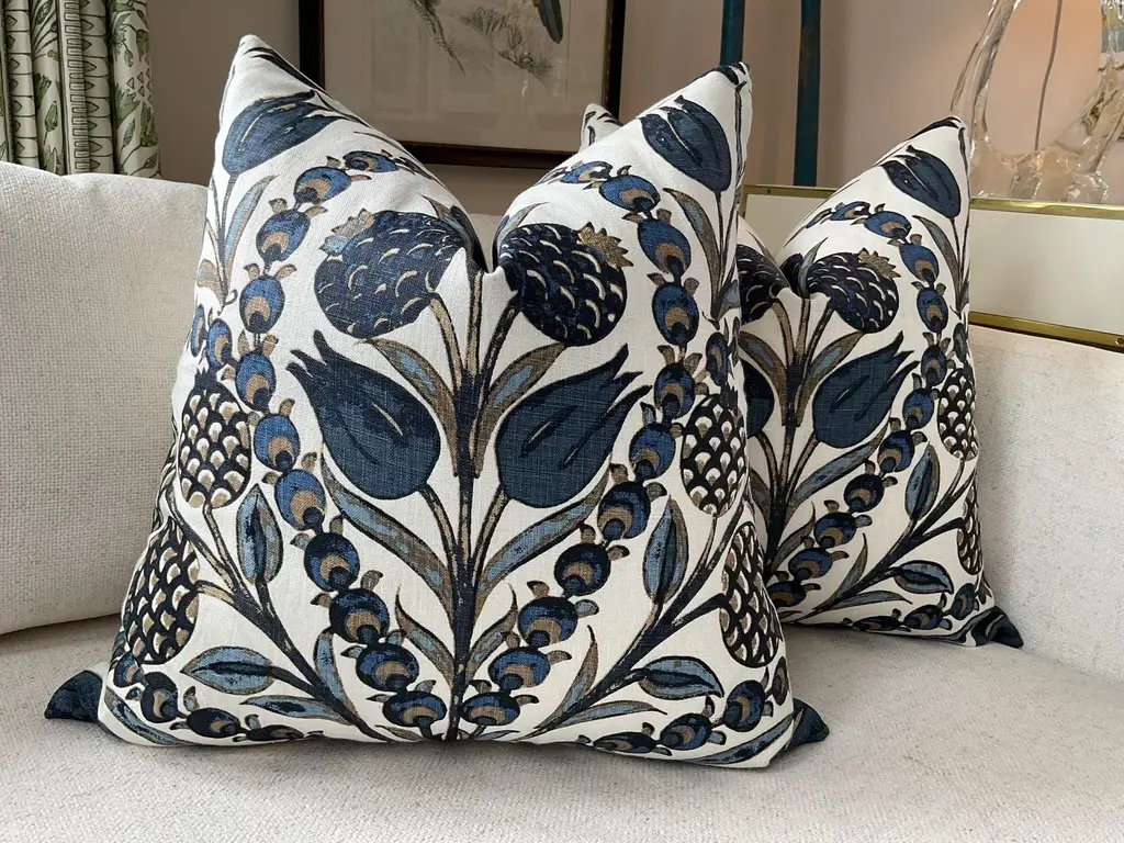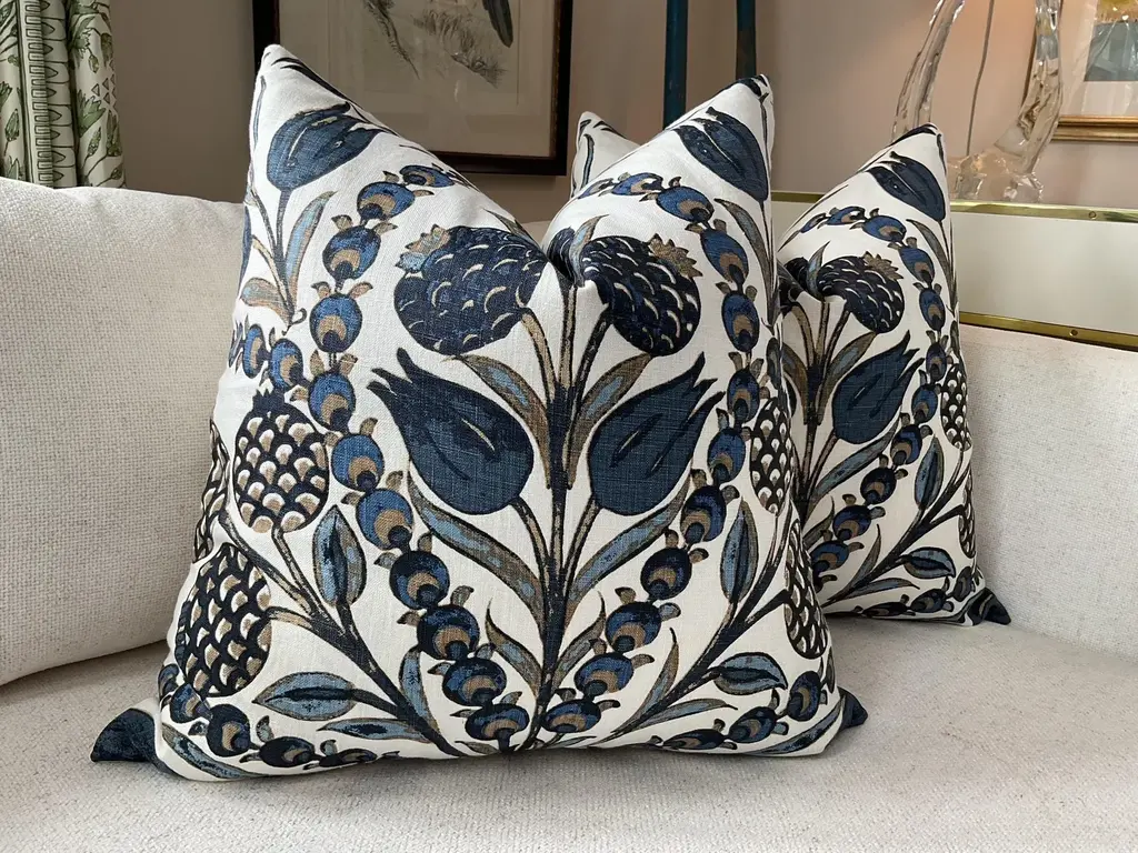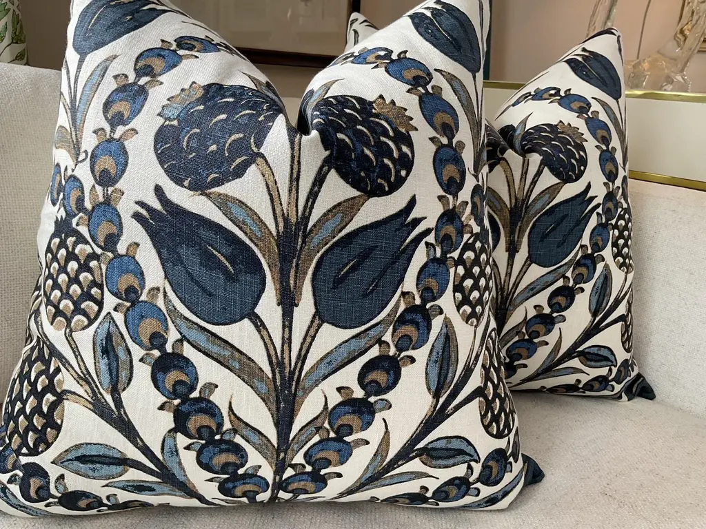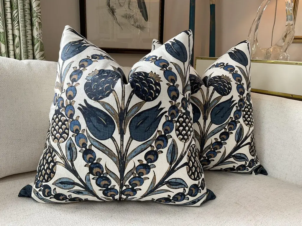Love this floral from Thibaut! Cornelia is a beautiful floral linen. These feature swirling shades of navy blues. Back is natural toned linen. The closure is by way of an invisible zipper. These will come backed with complementary off white linen. Last pic shows backing. These will come as a 22" pair with plush down inserts.