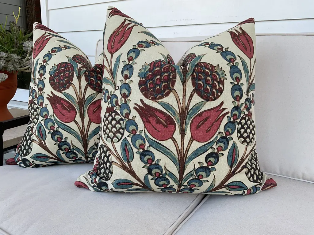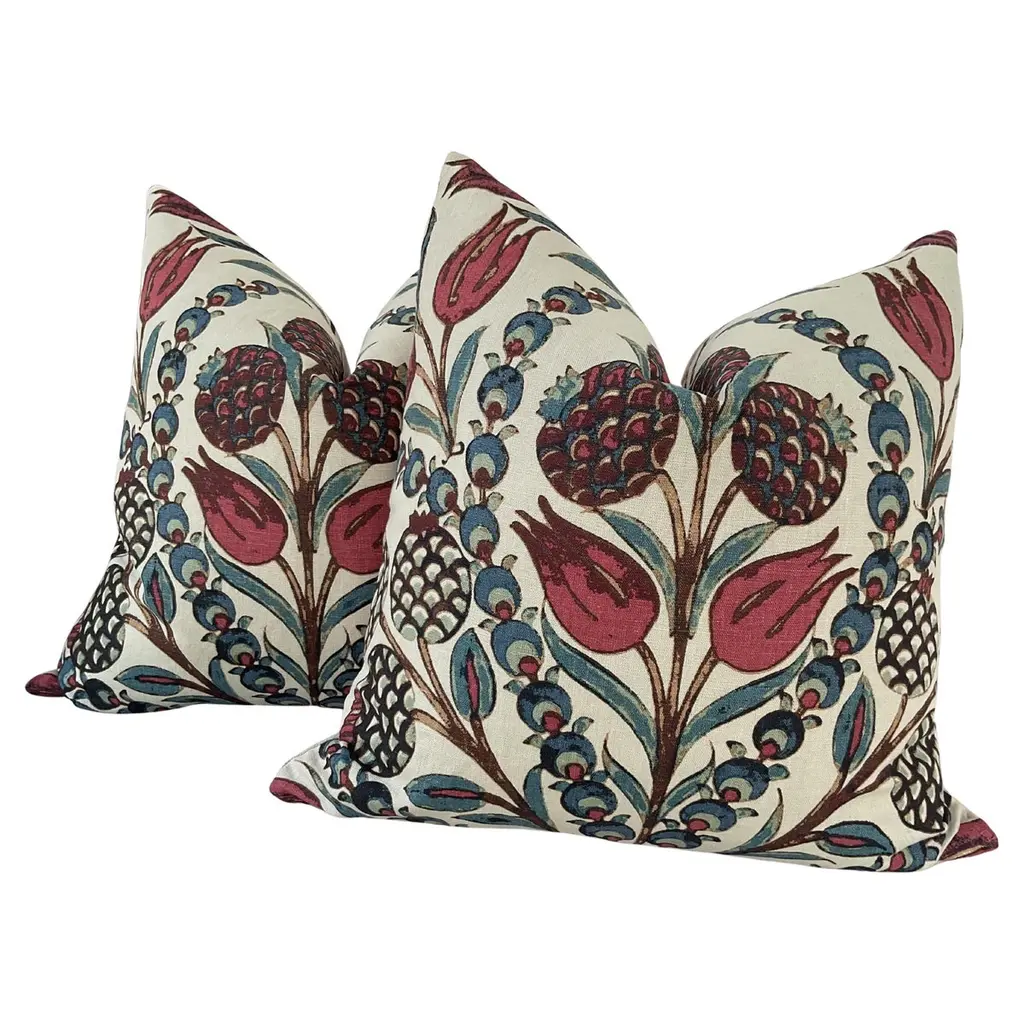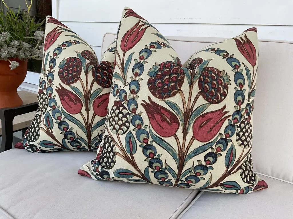 Love this print from Thibaut! Cornelia is a beautiful floral linen. These feature swirling shades of reds and teal. Back is cream toned linen. The closure is by way of an invisible zipper. These will come backed with complementary off white linen. These will come as a 22" pair with plush down inserts