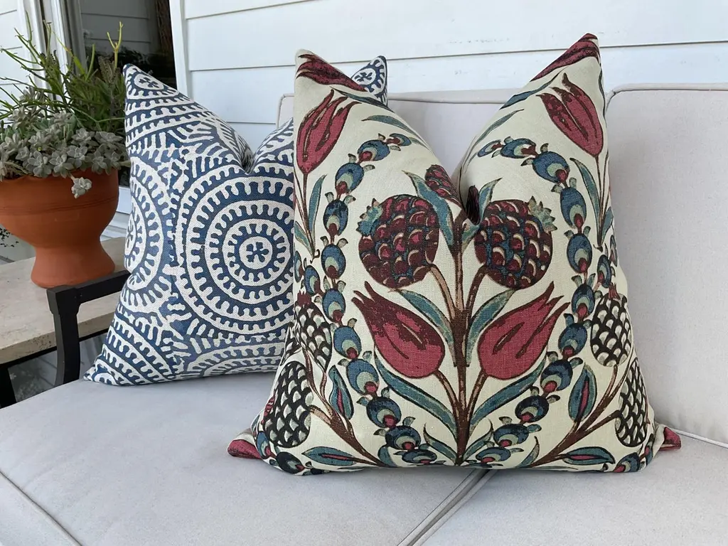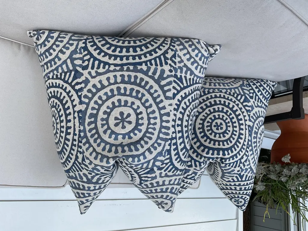 From Thibaut's Paramount collection, "Kasai" in navy blue is an ikat, medallion design in aqua, printed on heavyweight cotton fabric. Coordinate oatmeal linen backing (Unless a both-sided option is chosen) and an invisible zipper complete these pillows.Sold as a 22" pair with plush-down inserts.Pattern Placement May vary according to Desired Dimension but will always feature a centered scene.