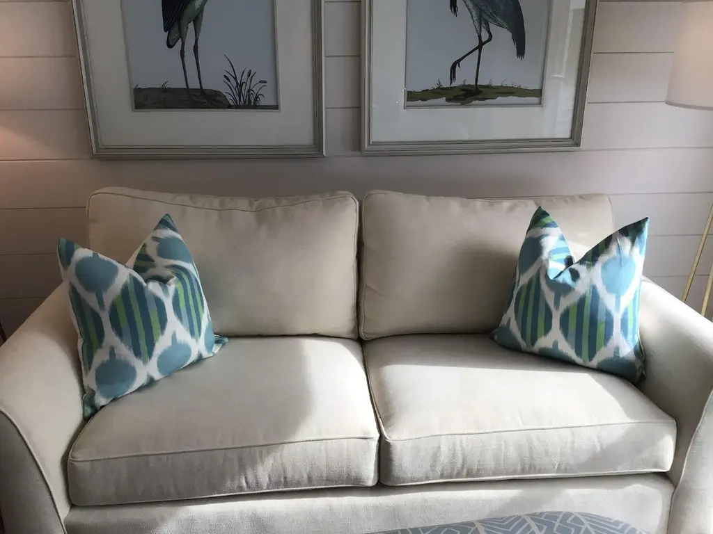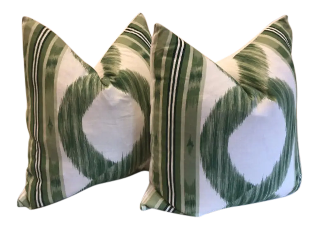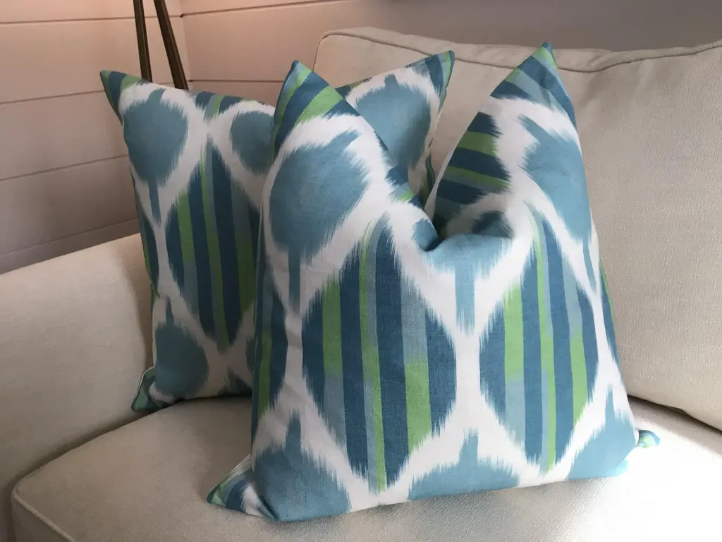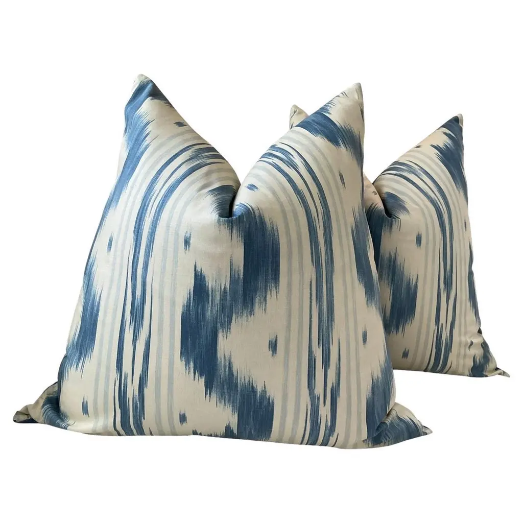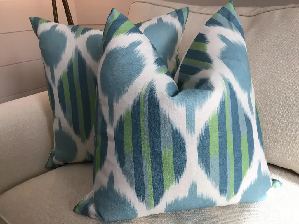 Another wonderful and versatile print from Thibaut!. Kimono in Robins Egg features an abstract ikat. It is shown here in Robins egg. Your order will come as a complete set of 22” pillows, featuring Thibaut Kimono fabric on the face and a coordinating white linen back. Closure will be by way of invisible zipper. This beautiful set will come complete with generous down inserts and be ready to use.