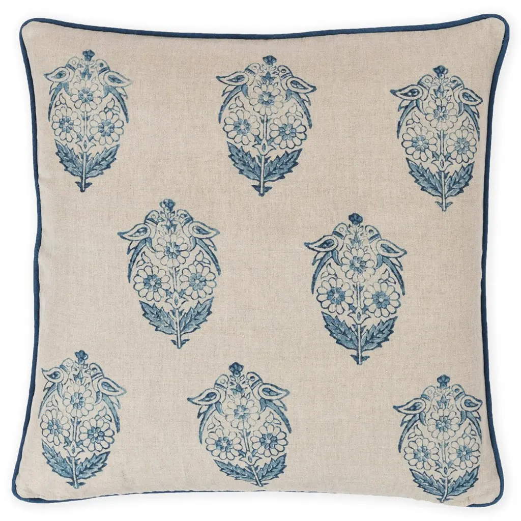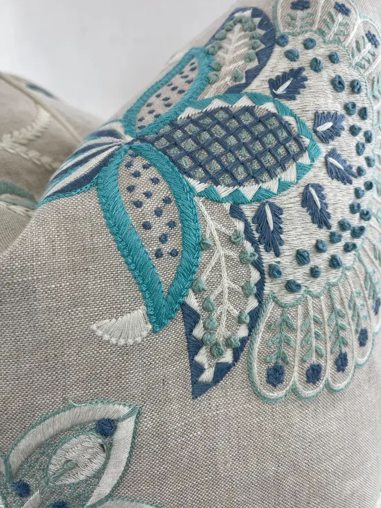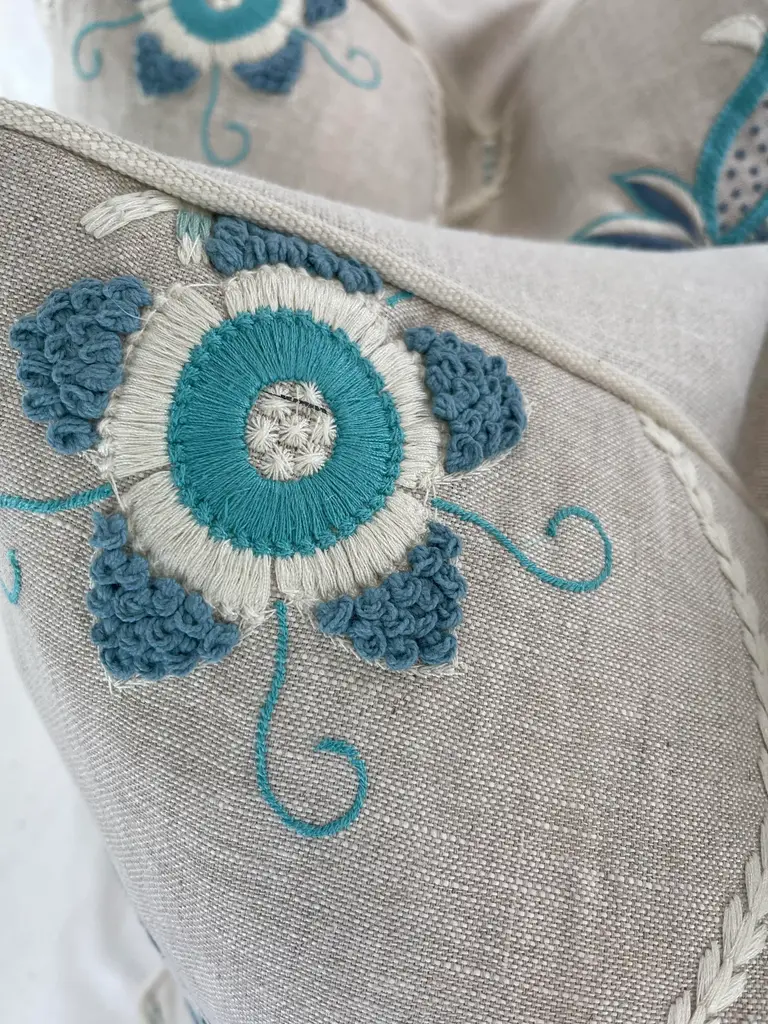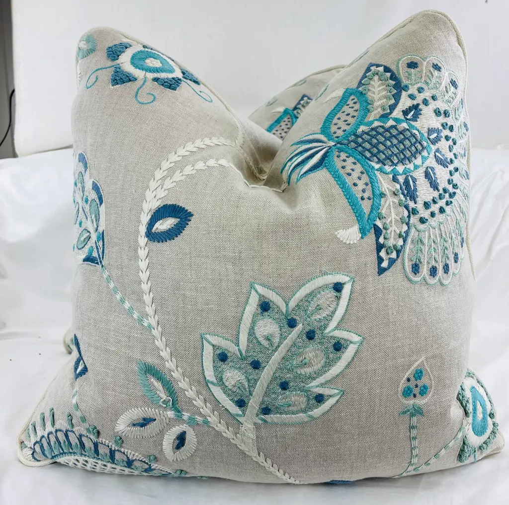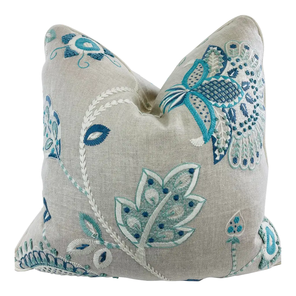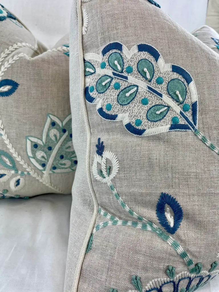 Custom pair of 22" pillows covered in Thibaut "Portofino Embroidery" in blue/aqua and backed in a coordinating Belgium linen. These pillows are welted in an off white Samuel & Sons decorative cording, have tapered corners to prevent dog ears, serged seams, hidden zippers and include feather/down inserts.
