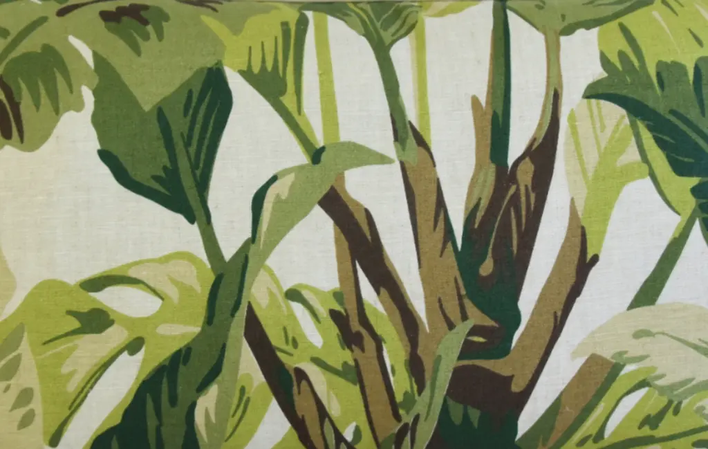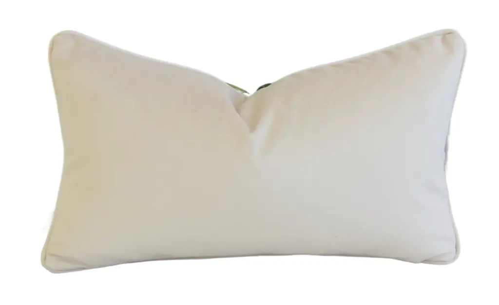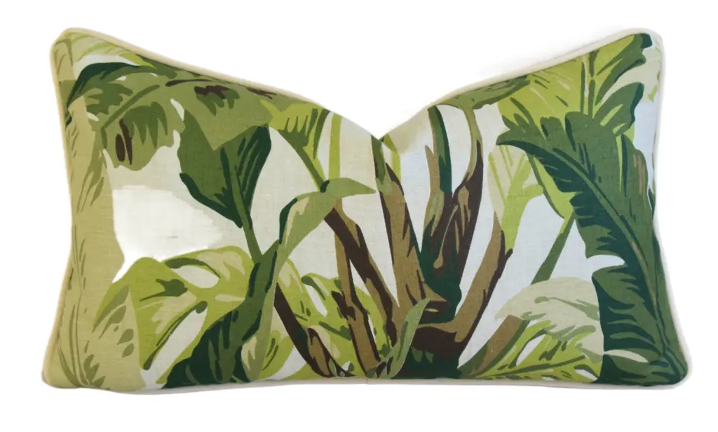 Custom-tailored designer pillow in Thibaut Fabrics "Travelers Palm Green" screen printed botanical linen fabric. Cream cotton-velvet fabric back. Custom cord trim. Zipper closure. New plump generous goose feather-and-down insert. Pattern placement will vary according to the fabric cut. Excellent new unused condition!!