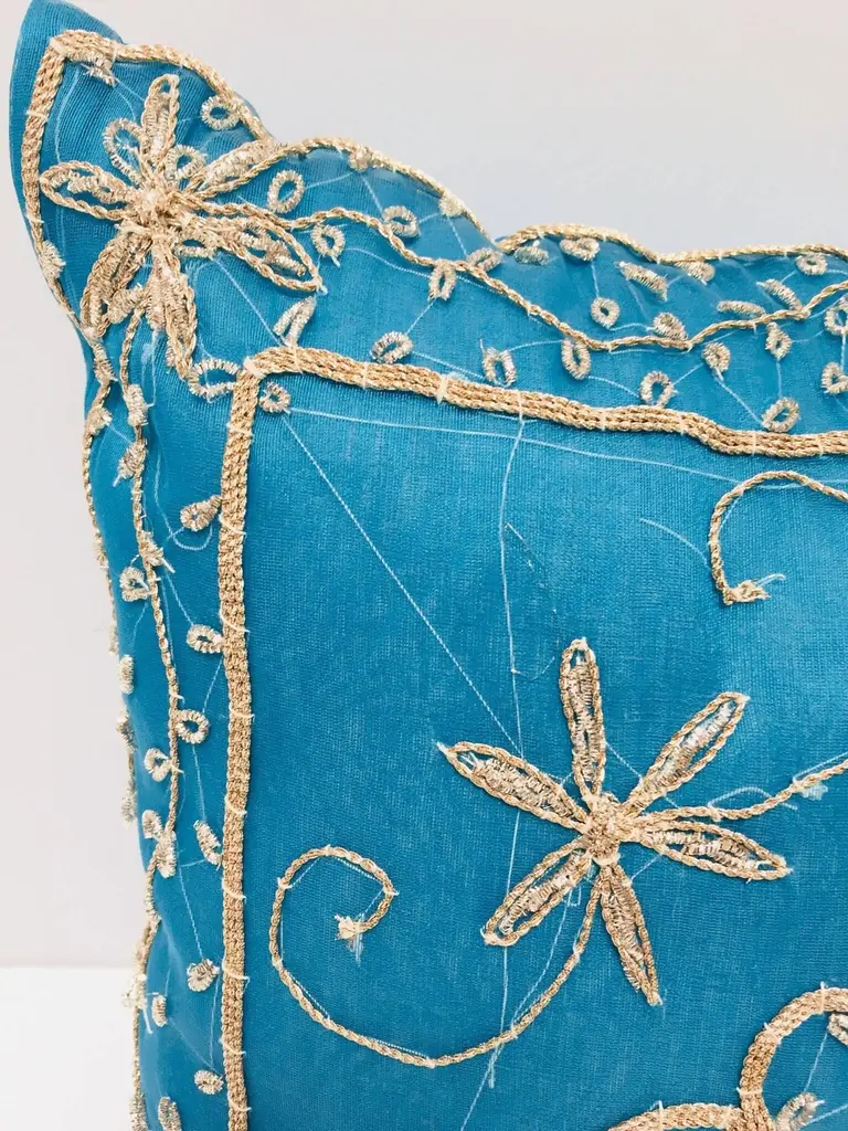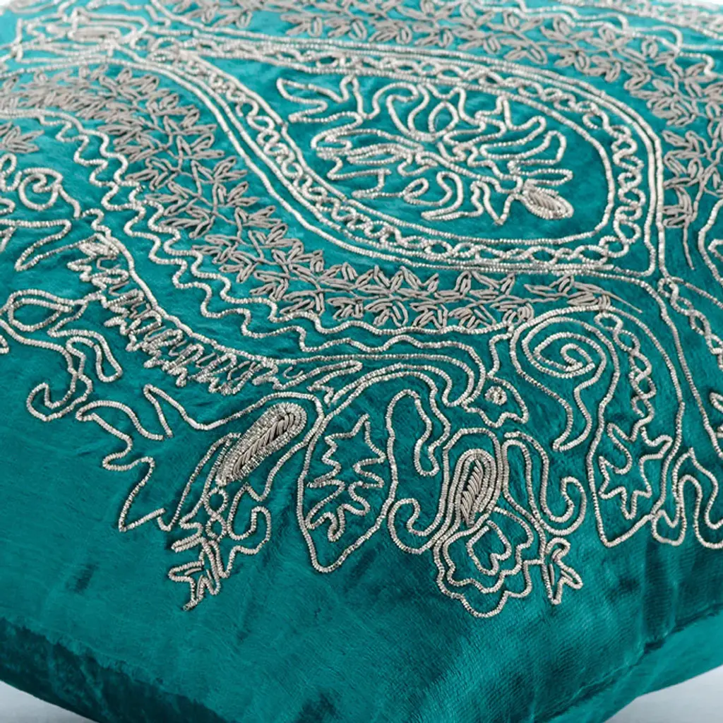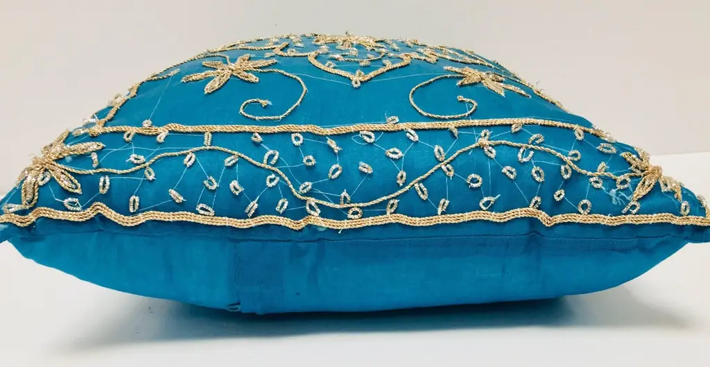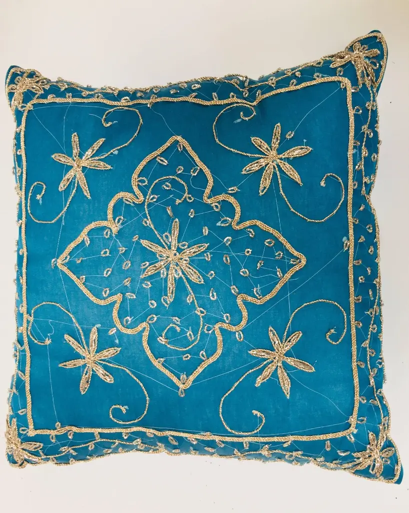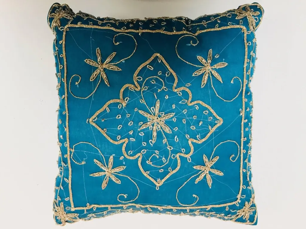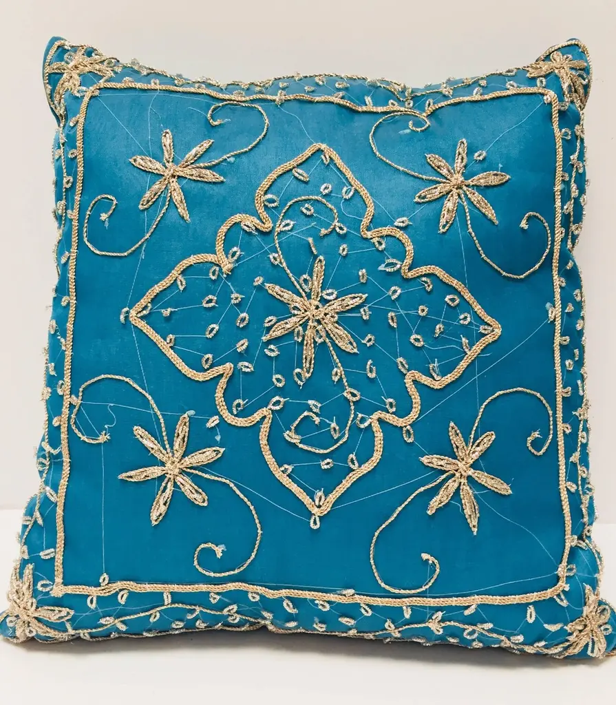 Throw decorative accent turquoise Moorish pillow embroidered and embellished with sequins with Moorish metallic threads, gold beads embroidery on turquoise.Heavily embellished border of metallic embroidery Moorish silver beads and threads.Handcrafted in India.