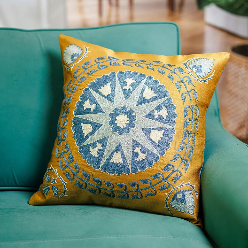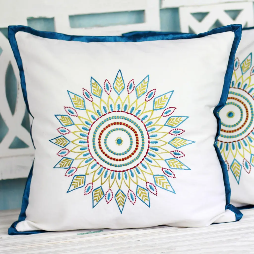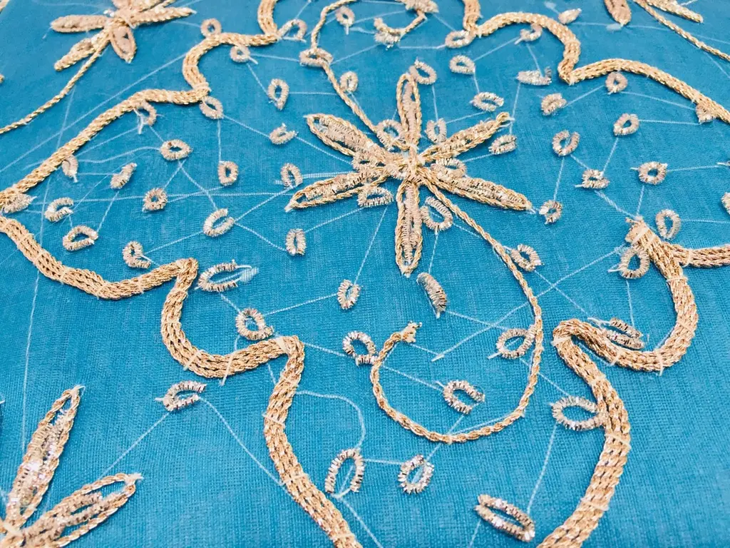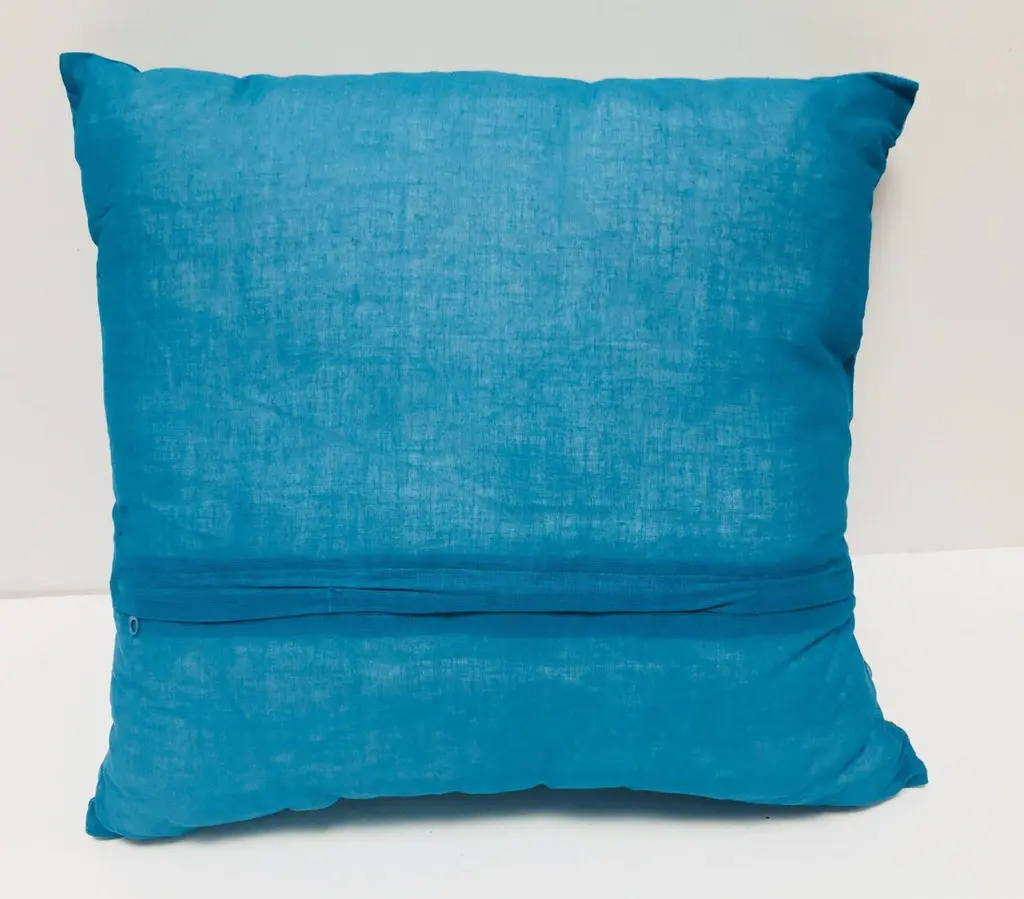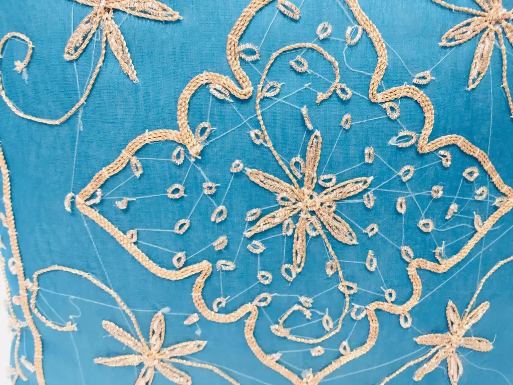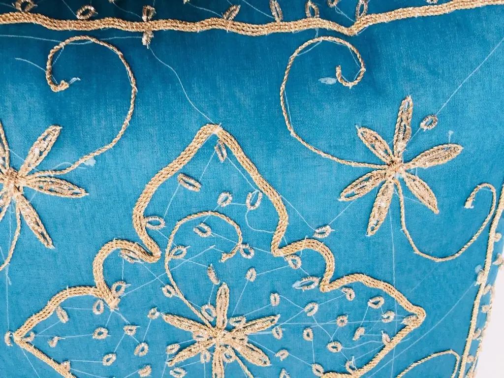 Throw decorative accent turquoise Moorish pillow embroidered and embellished with sequins with Moorish metallic threads, gold beads embroidery on turquoise.Heavily embellished border of metallic embroidery Moorish silver beads and threads.Handcrafted in India.