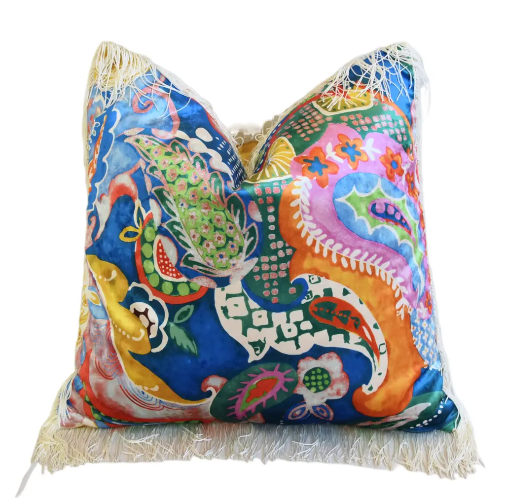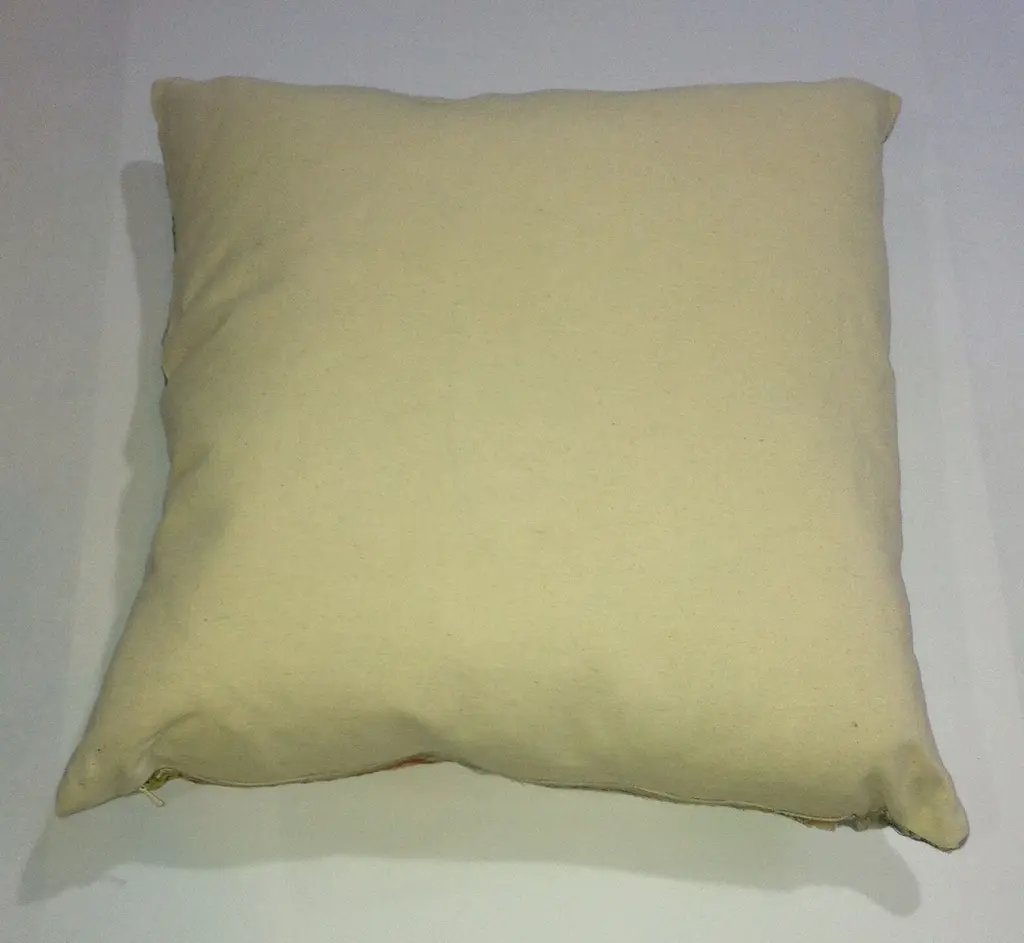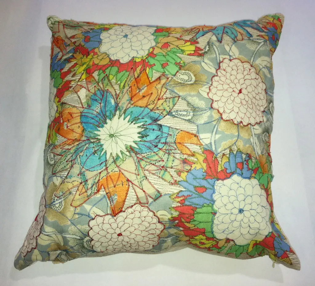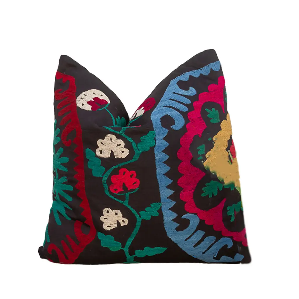 A pair of beautifully hand-embroidered pillows from India with a multicolored floral design. Solid back, zipper closure on side. Pillow covers are made of 100% cotton. Goose down/feather inserts included. Dry-clean only.