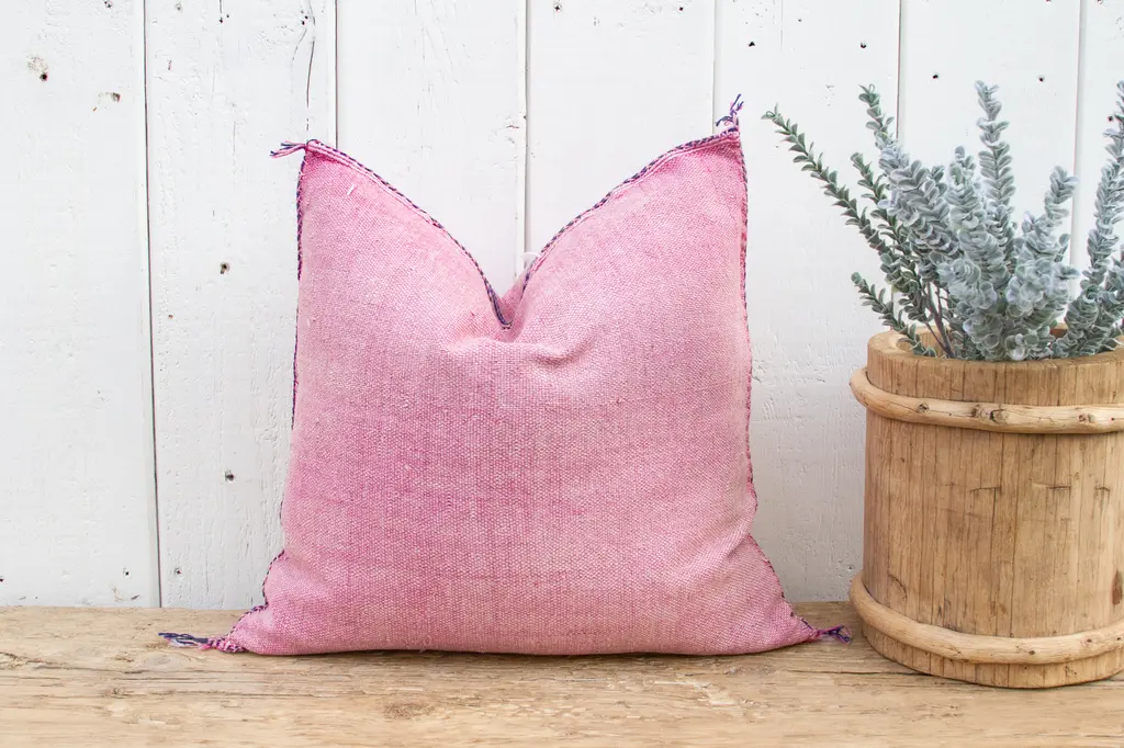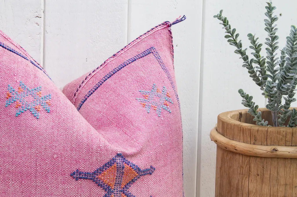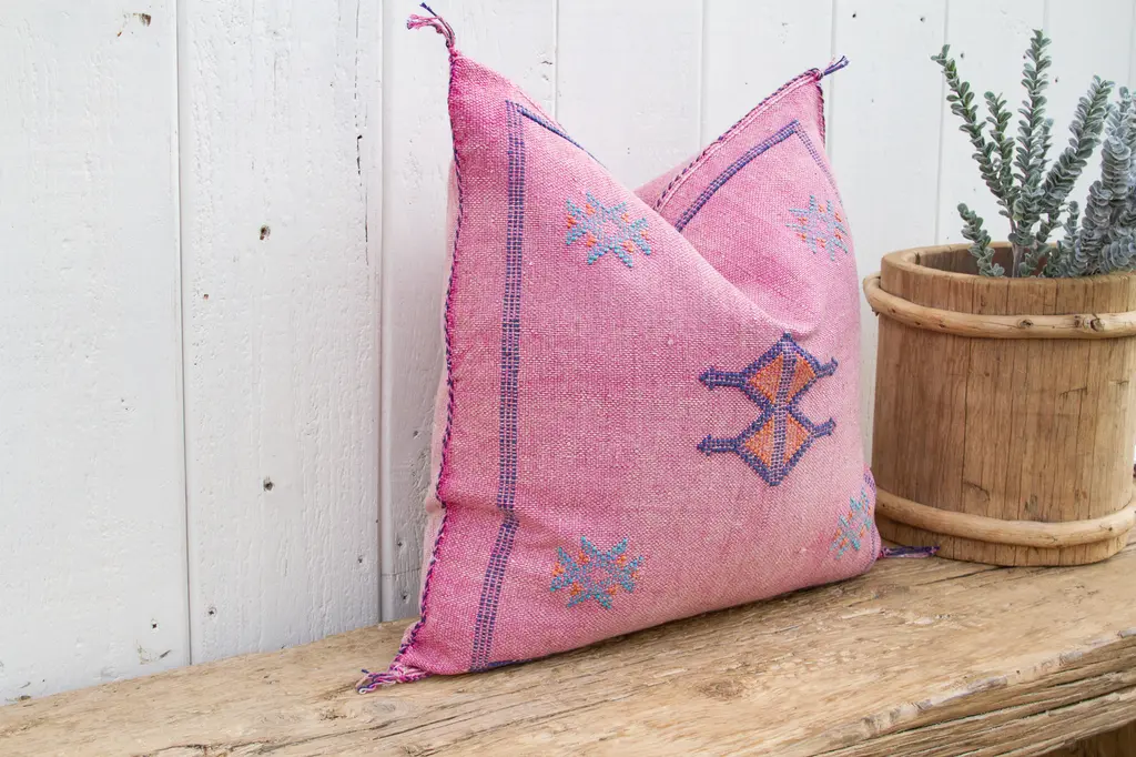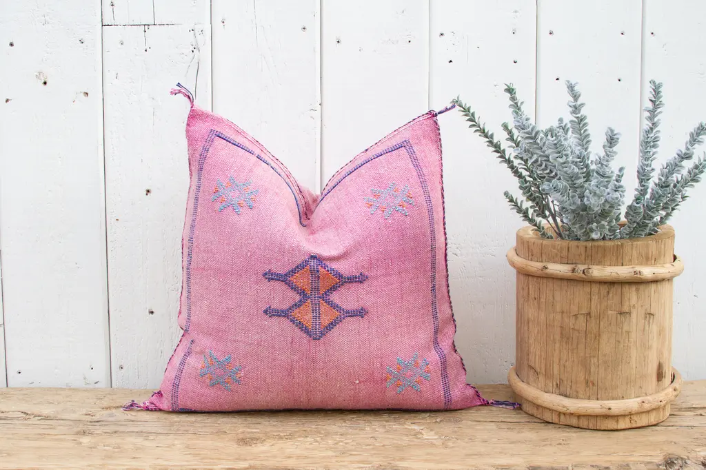 This gorgeous pillow is entirely hand-woven from silk that comes from a Sabra cactus plant. Every pillow is beautifully embroidered with a unique tribal motif that varies from every other pillow. Each pillow is dyed using vegetable dye using a special hand dying technique that gives each one their own lovely faded and beautifully aged colors. This pillow has a zipper closure, down blend insert is included.