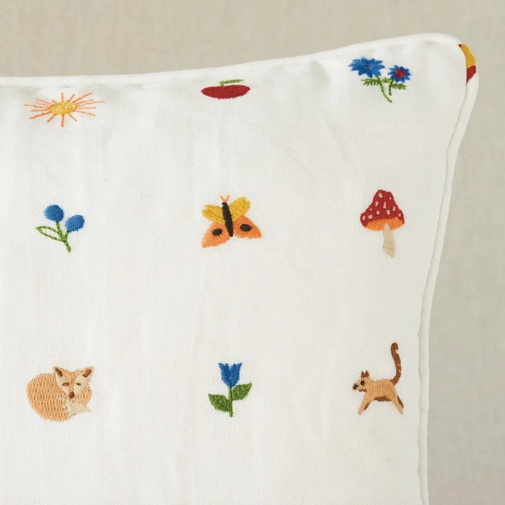 This pillow features Tiny Things Embroidery with a self welt finish. An airy small-scale pattern, multi-colored Tiny Things Embroidery is animated by a charming menagerie of woodland creatures, plants and insects. Pillow includes a feather/down fill insert and hidden zipper closure.
