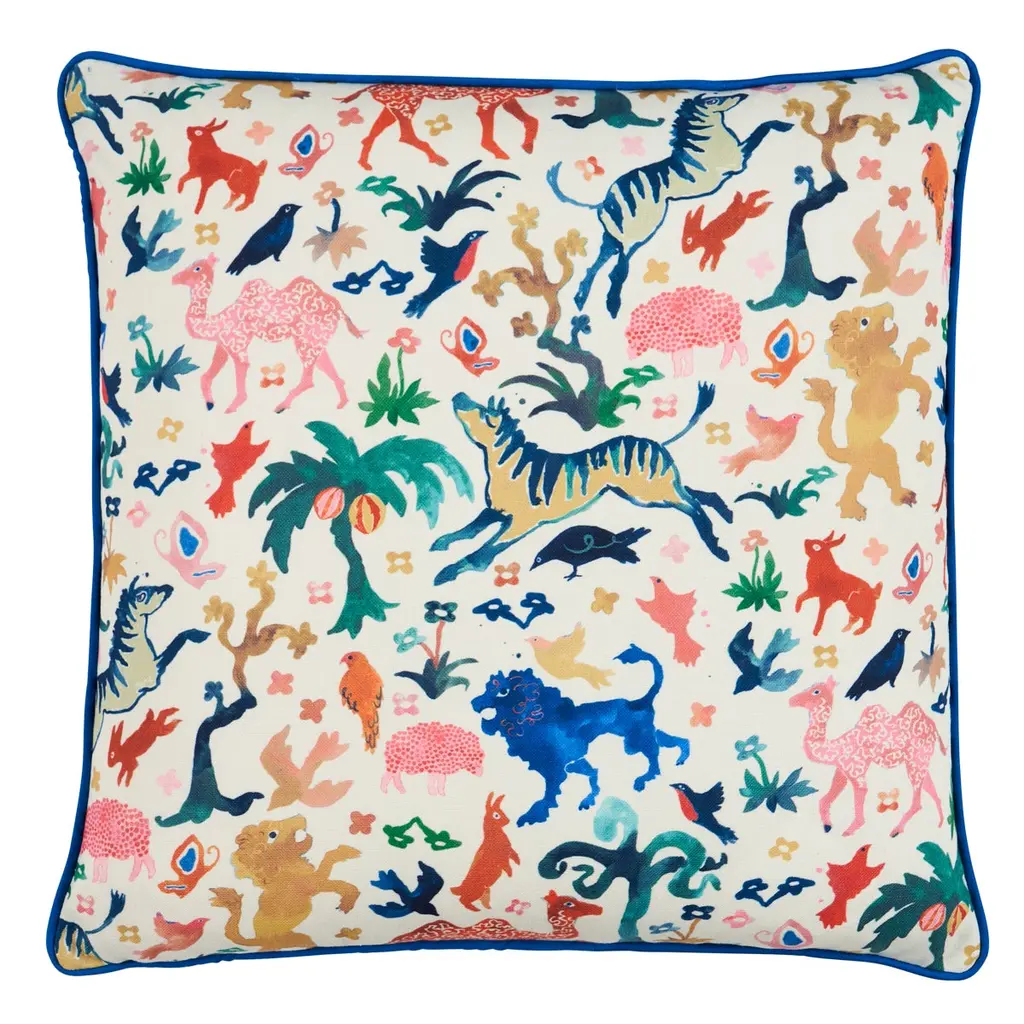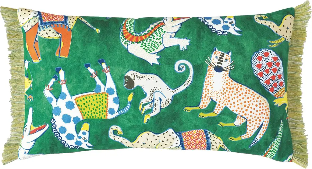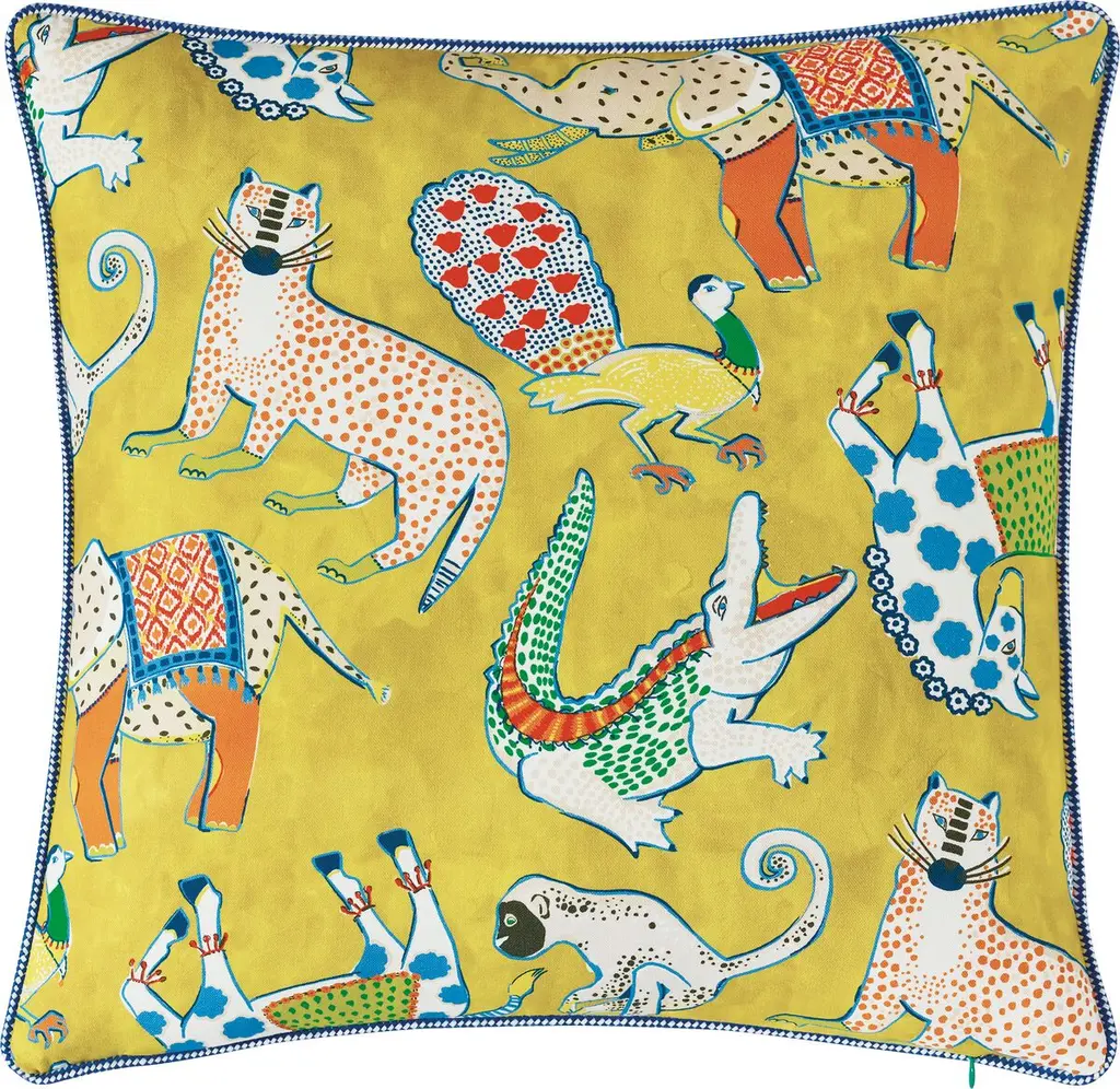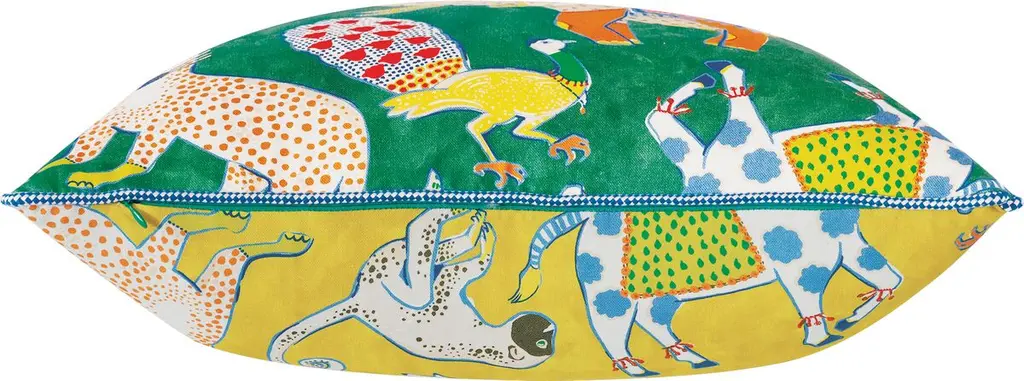 This reversible throw pillow gives you twice the color and charm. One side features whimsical zoo animals against a green background; the reverse features the animals against a yellow background. Blue-and-white cord trim adds to the fun. Made in the USA, the pillow is filled with plume feathers for long-lasting comfort. Hidden zipper closure.