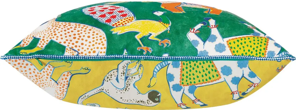 This reversible throw pillow gives you twice the color and charm. One side features whimsical zoo animals against a green background; the reverse features the animals against a yellow background. Blue-and-white cord trim adds to the fun. Made in the USA, the pillow is filled with plume feathers for long-lasting comfort. Hidden zipper closure.