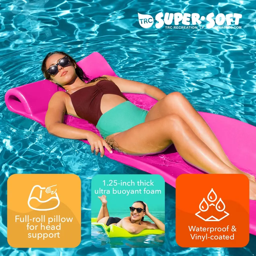 Relax on the lake or in your backyard pool without worrying about air pumps and inflation. Enjoy the sun and water fully with the TRC Recreation Splash Lounger Pool Raft. Made with exceptional durability in mind, this travel pool float features a 1.25-inch-thick buoyant foam and a waterproof vinyl coating to withstand frequent use. Pool rafts for adults feature a spacious design that accommodates a full-sized adult with ease, and the built-in roll pillow of the swim float adds an extra layer of comfort, cradling your head and neck while providing additional buoyancy to keep you afloat. Additionally, the smooth finish lends a sleek look to the pool float, enhancing the overall appeal of any setting. To maintain the pool floatie, you can simply wipe down the smooth vinyl surface with a damp cloth as needed to keep it looking pristine. Spend less time cleaning and more time enjoying your outdoor activities with this easy-to-maintain giant pool float. Whether you're lounging solo or spending time with friends, this pool float adult mat promises an unparalleled relaxation experience on the water. Enjoy your leisure time with a floating lounger that is an excellent addition to your pool accessories, and make every moment in the sun unforgettable. When looking for floaties for adults, choose comfort, durability, and style no matter the adventure. Choose the TRC Recreation Splash Adult Pool Float Lounger.