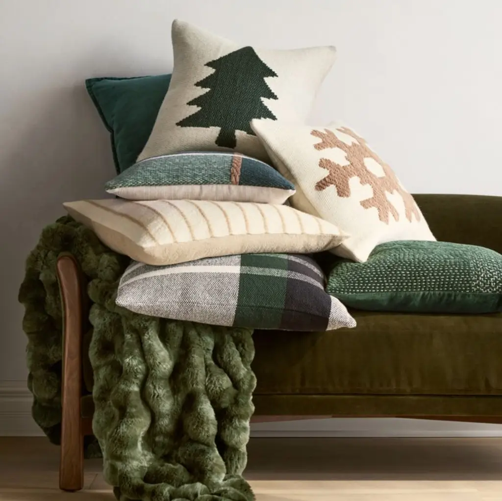 Cozy up your holiday decor with our ivory throw pillow focused on the stylized silhouette of a single spruce green pine tree. Featuring a kilim weavea tight interweaving of warp and weft strands often used to make carpetsthe square pillow highlights the angled shapes, heathered color and rustic texture characteristic of this celebrated weaving technique. Our exclusive pillows include your choice of a plush feather-down or lofty down-alternative insert.