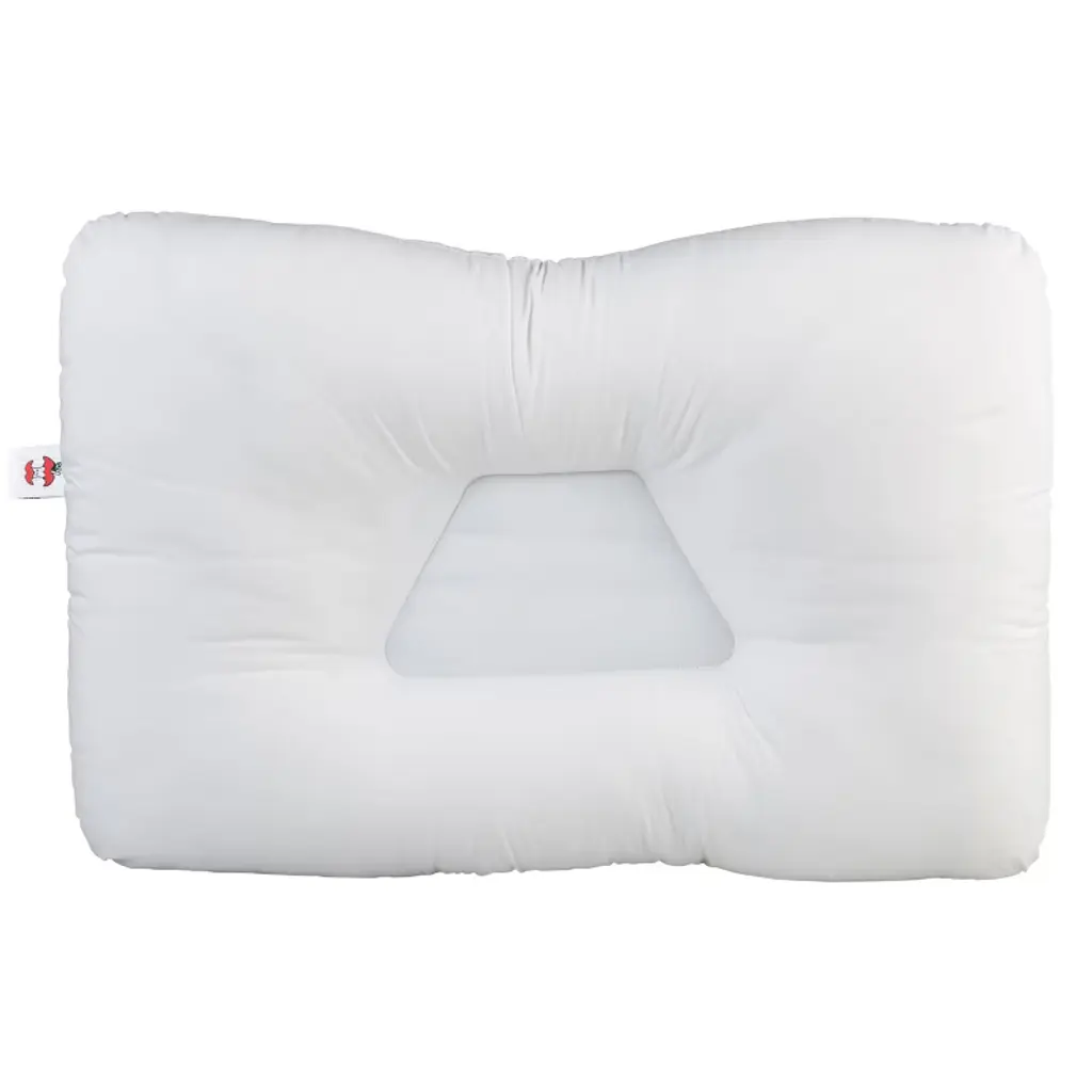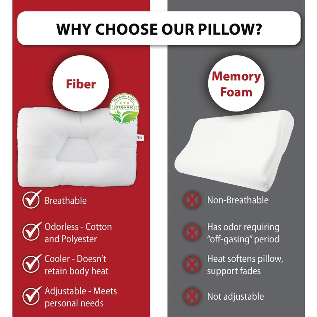 The Tri-Core Cervical Support Pillow helps alleviate headaches and neck pain by providing proper alignment of the neck while sleeping, and is commonly used to help treat a variety of conditions affecting the neck and shoulders. For back sleeping, a firm cervical roll supports the neck while a shaped center gently cradles head for better sleep. For side sleeping, the raised side areas help keep the head level for proper alignment of the spine. In order to provide therapeutic benefits and help restore the natural curve of the neck, two very firm cervical rolls provide different support options. Use the smaller, firm cervical roll for slightly less support if you are in the adjustment phase or if you prefer slightly less support; use the larger, firm cervical roll for maximum support. For those who are new to sleeping on a cervical support pillow, or prefer gentle support, the “Gentle” version may be a better option. It may take some time to adjust to this cervical pillow and immediate overuse may increase neck pain. Those who slowly ease their way into orthopedic correction, by alternating between this pillow and their current pillow, achieve the best results. The gentle version provides moderate to firm support, while the firm version provides very firm support. Three Sizes Accommodate Most Body Types Full Size: 24 x 16 x 5 inches, Most adults find this size appropriate. (Not included, show for size comparison)Midsize: 22 x 15 x 4 inches, A mid-sized or smaller framed person would likely find this size appropriate. (Not included, shown for size comparison)Petite: 19 x 12 x 4 inches, A smaller framed person would likely find this size appropriate. Note: It may take several weeks for your body to fully adjust to this pillow. Alternate with your current pillow, as needed. Fits in a standard pillow case. Pillow size: 24" x 16" (61cm x 40.5cm). Assembled in the USA of Globally Sourced Materials. 100% virgin polyester fiber fill with a cotton/ polyester cover.