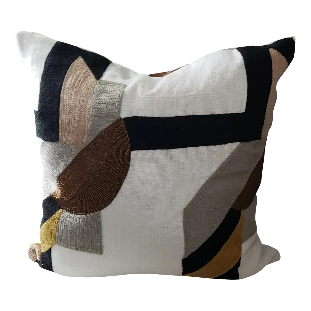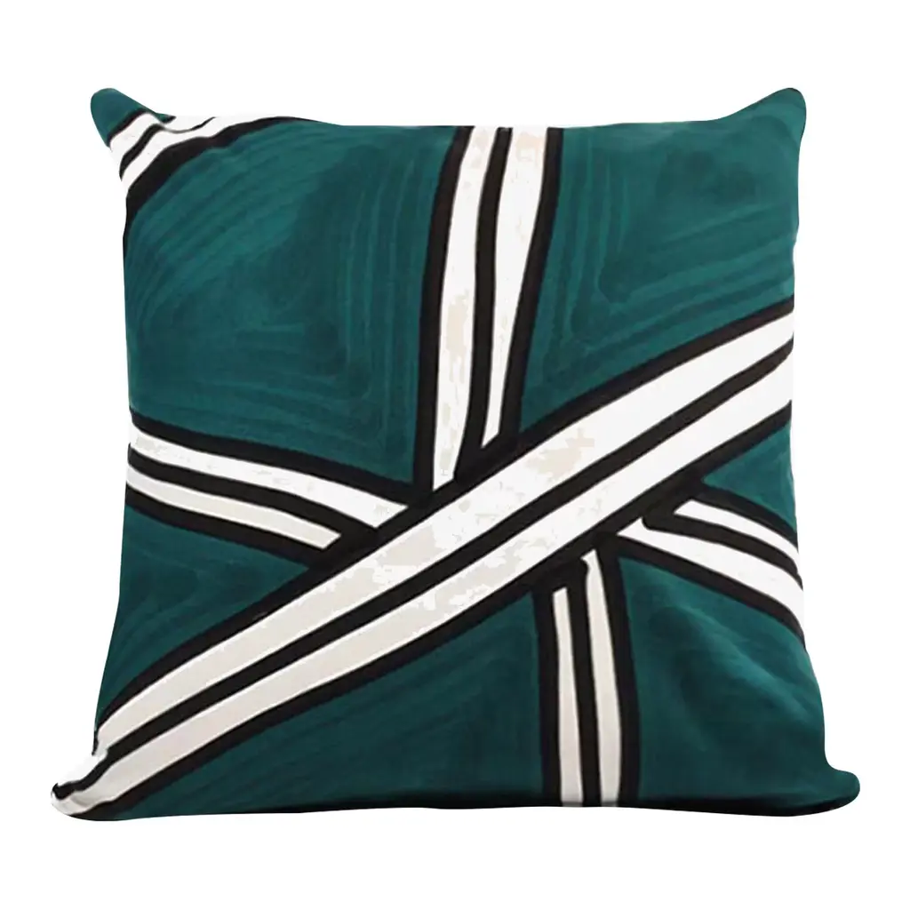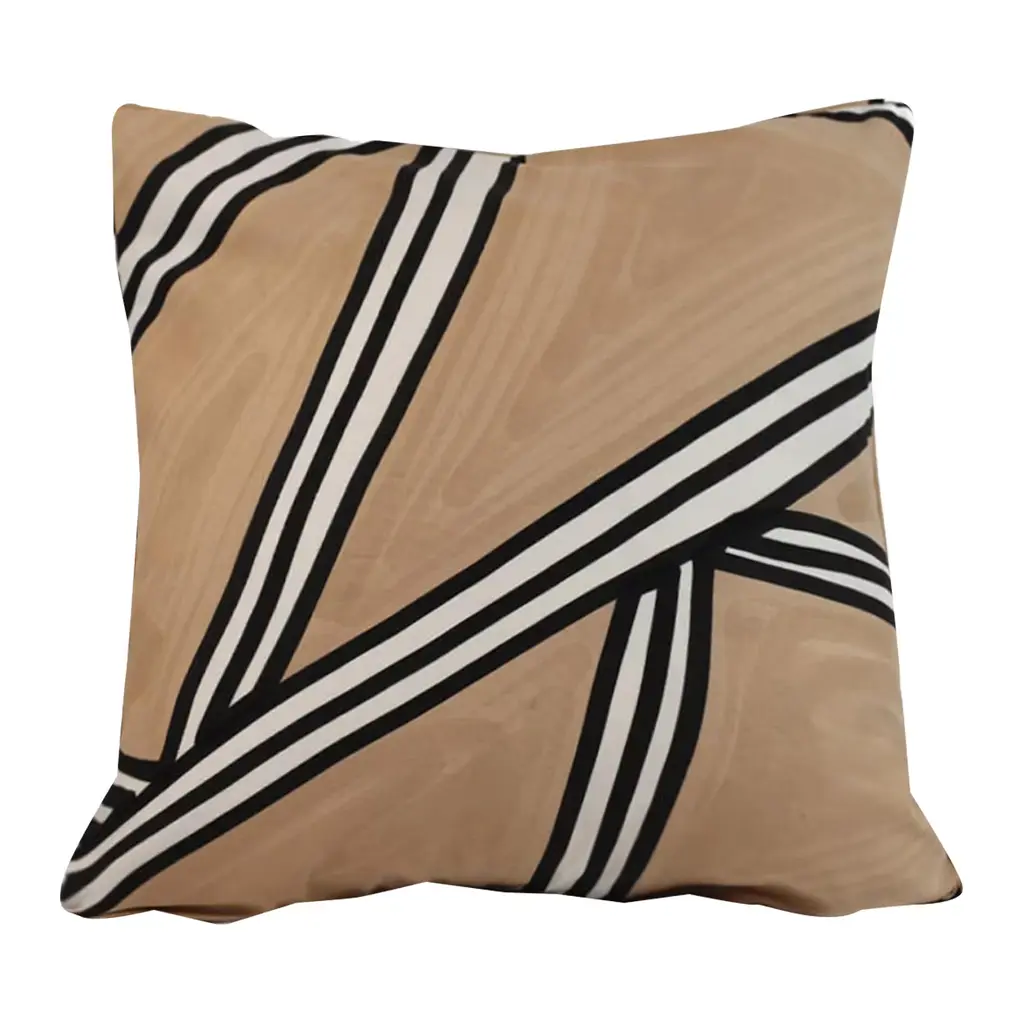 This striking cushionhas a down insert with a cover in 100% cotton decorated using the pigment printing technique with a geometric pattern of white and black lines over a red textured background.