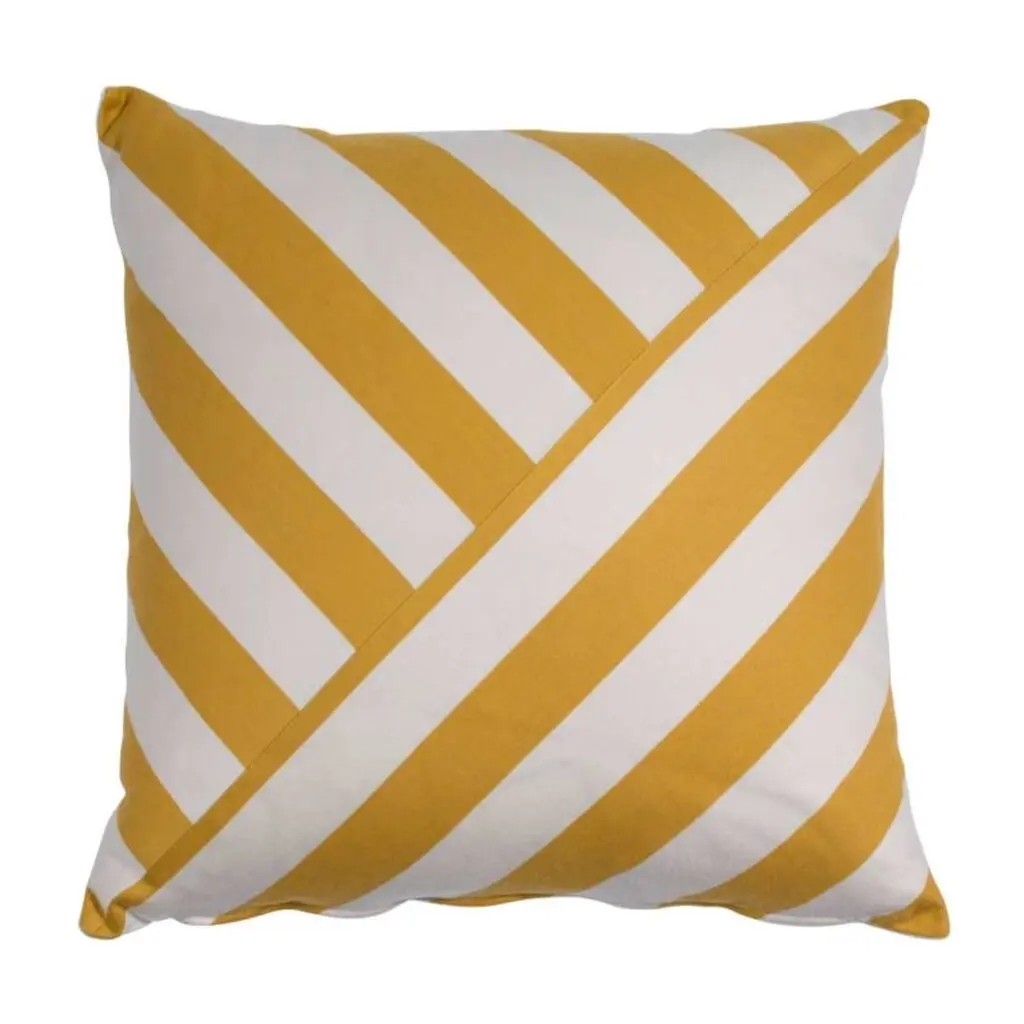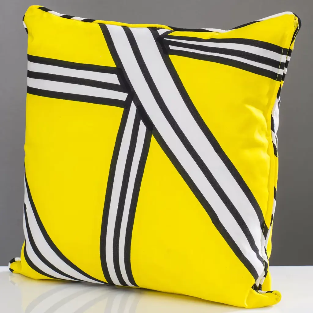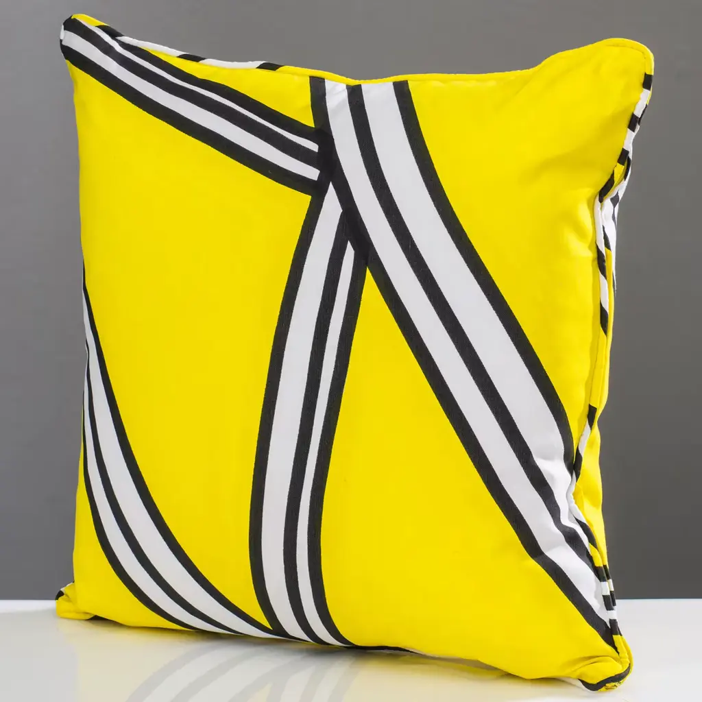 This elegant cushion has a down insert with a 100% cotton cover decorated using the pigment printing technique with a striking geometric pattern of parallel and perpendicular white and black lines over a vivid lemon yellow textured background.