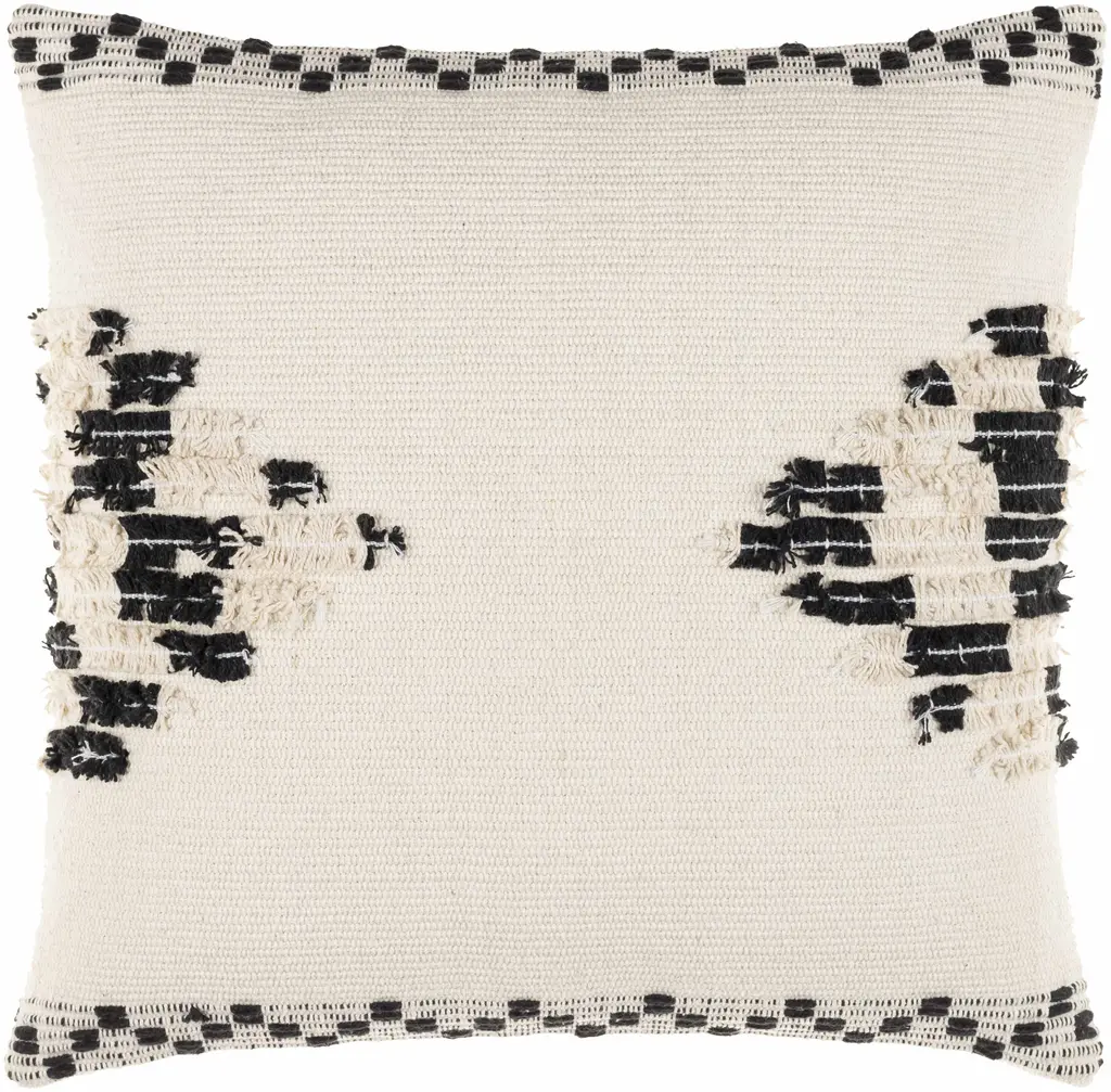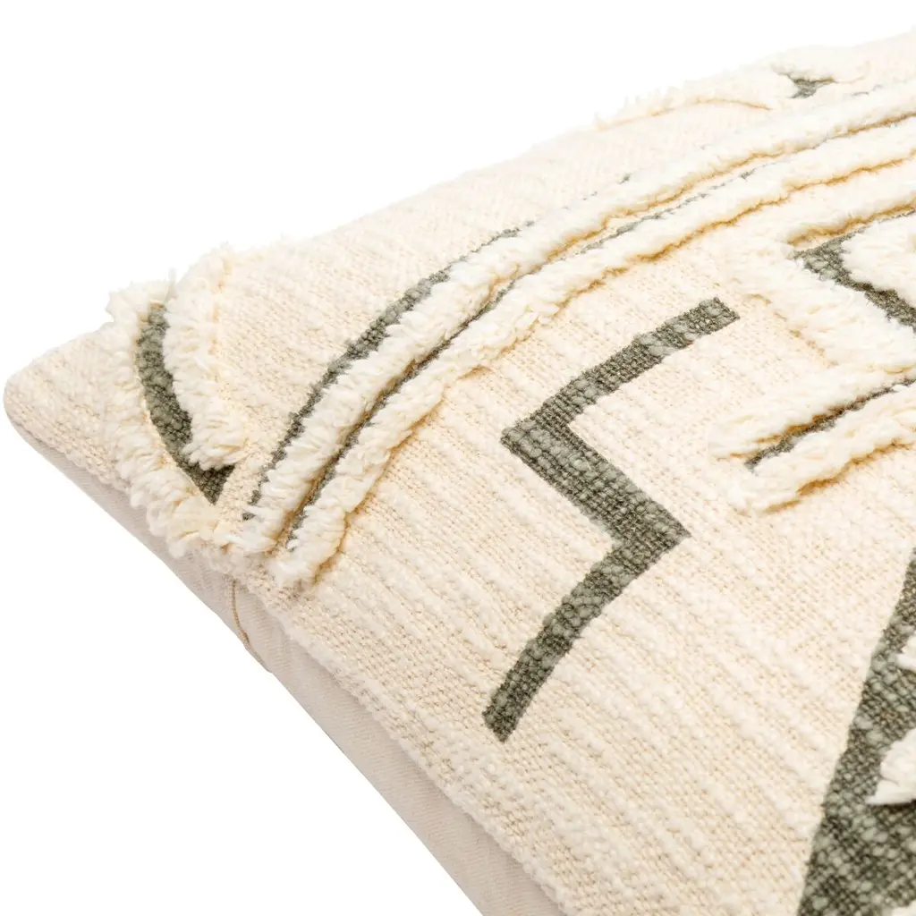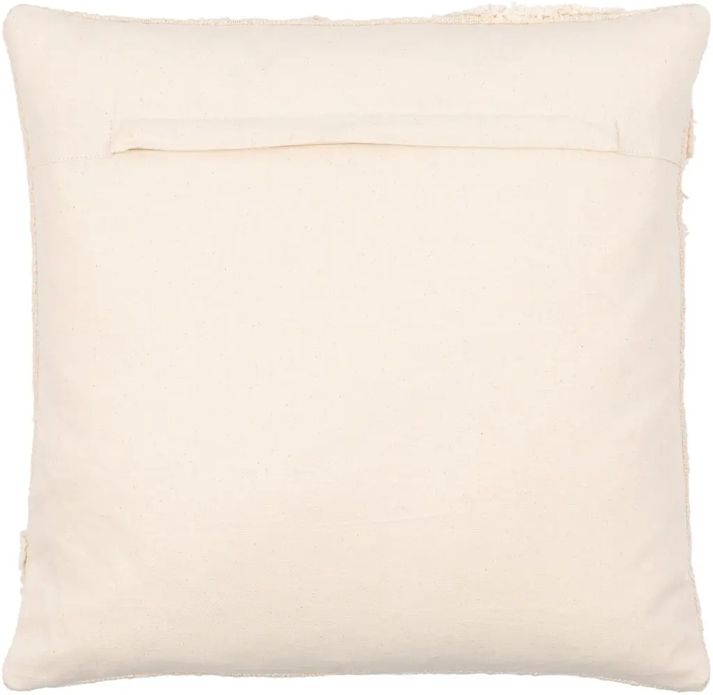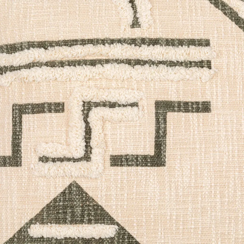 Tufted detailing adds fluffy texture and boho chic to geometric motif that adorns the front of this pillow. Down fill ensures luxe loftiness. Solid back.
