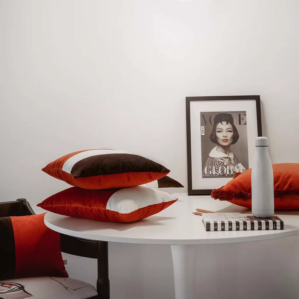 Triple colours pillow, red brick, black and white, ideal for decorating beds with design and elegance, to be positioned on the left side. It may be combined with the right cushion with white, black and mustard colours. Fabric 100% PL Velvet, Padding 100% PL(Washing Machine 40°). Customizable for colour and size, please ask the Concierge for details.