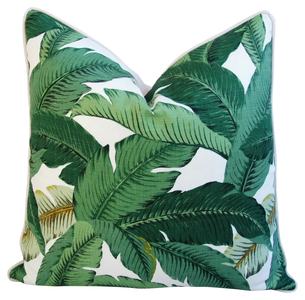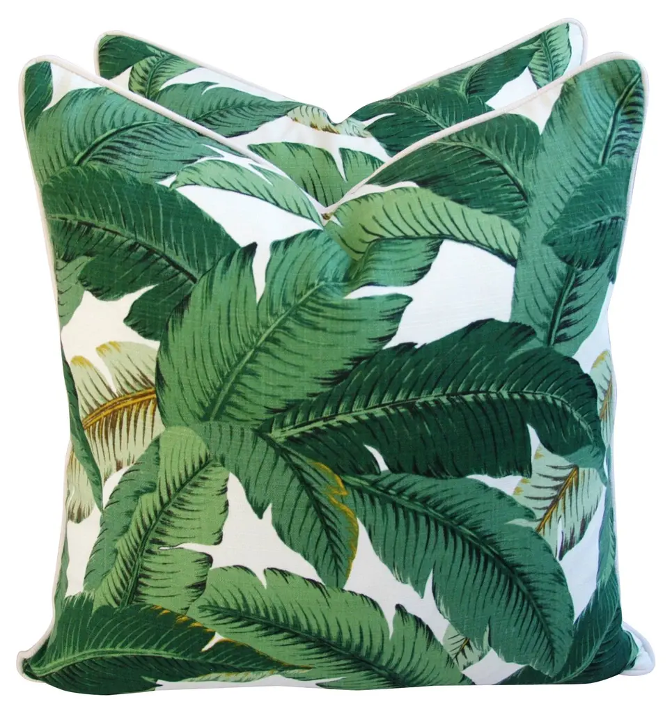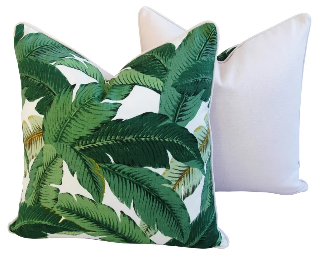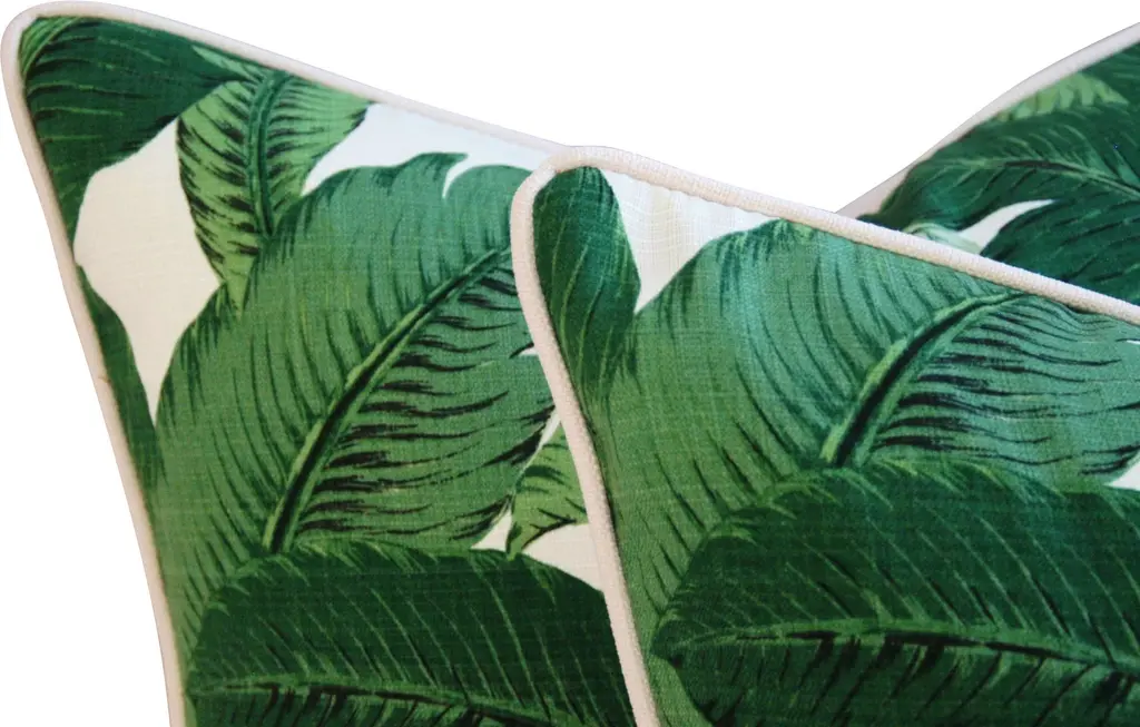 Pair of custom tailored pillows in tropical banana leaf print fabric. New bone white velvet backs and coordinating velvet cord trim. Hidden zipper closures. New generous plump goose feather-and-down inserts.