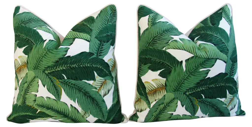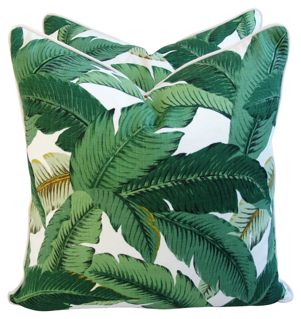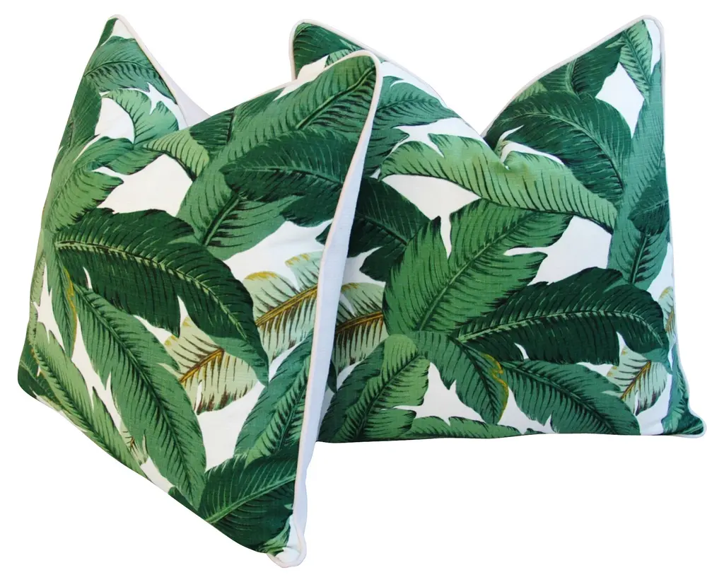 Pair of large custom-made pillows in an iconic tropical banana leaf print fabric. White-colored velvet backs. Custom-tailored cord trim. Zipper closures. and filled with generous plump goose feather/down inserts with top-quality stitching and workmanship throughout. Excellent unused condition.
