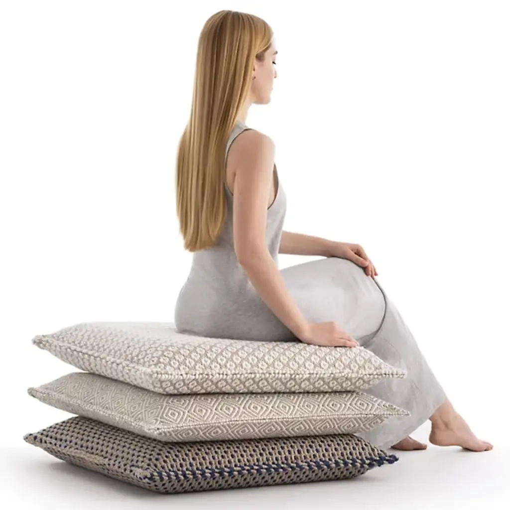 The Tuareg Outdoor Pillow, Set of 3 from Gan Rugs features three hand-loomed cushions crafted from recycled PET, suitable for both indoor and outdoor use. The lightweight design allows easy movement between different configurations and stacking arrangements. Each pillow coordinates with matching rugs from the Nomad collection. Multiple units create customized floor seating that adapts to immediate spatial requirements and comfort preferences through varied arrangements and height combinations.