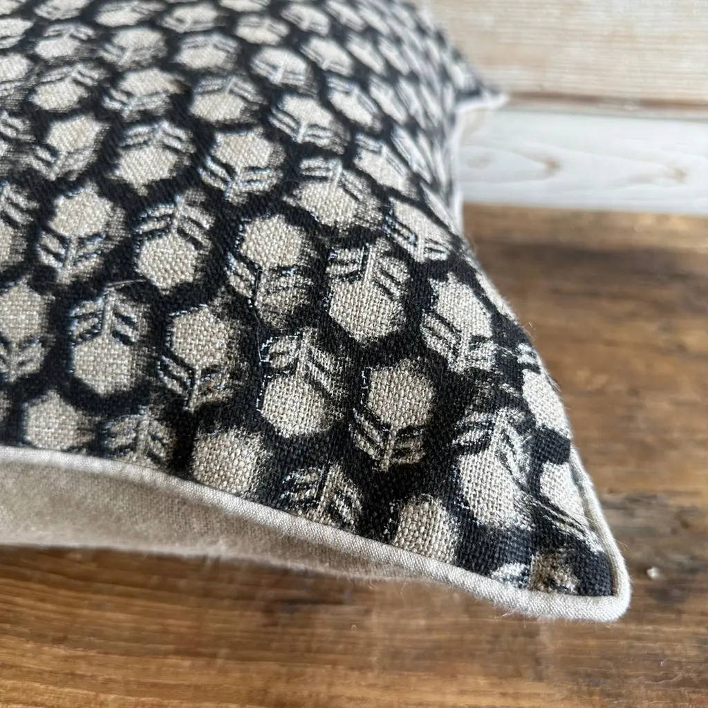 Tulsi Accent PillowColor: Noir on Natural100% linen, with hand blocked patternPiping and zipper closureDown Feather insert is included.Machine wash ok, cold with dark colors, hang dryDry clean recommended.